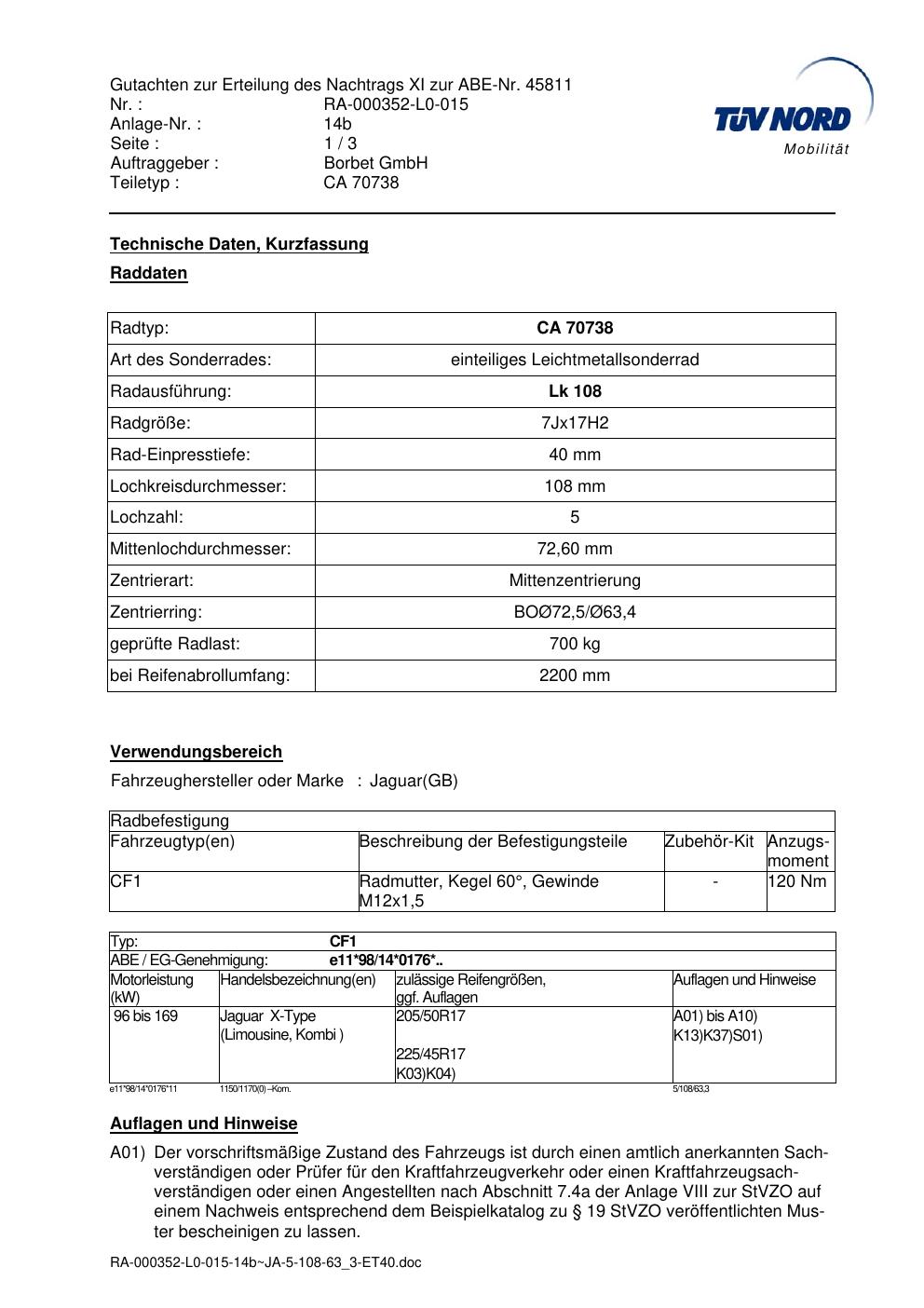 Dieses Gutachten (abe) bezieht sich auf die Alufelge Borbet CA 70738 in der Ausführung 7Jx17 ET 0, Mittenloch 0 mm (KBA 45811). Im PDF findest du typischerweise zulässige Reifengrößen, Auflagen/Anbauhinweise und – je nach Dokument – Hinweise zur Eintragung.