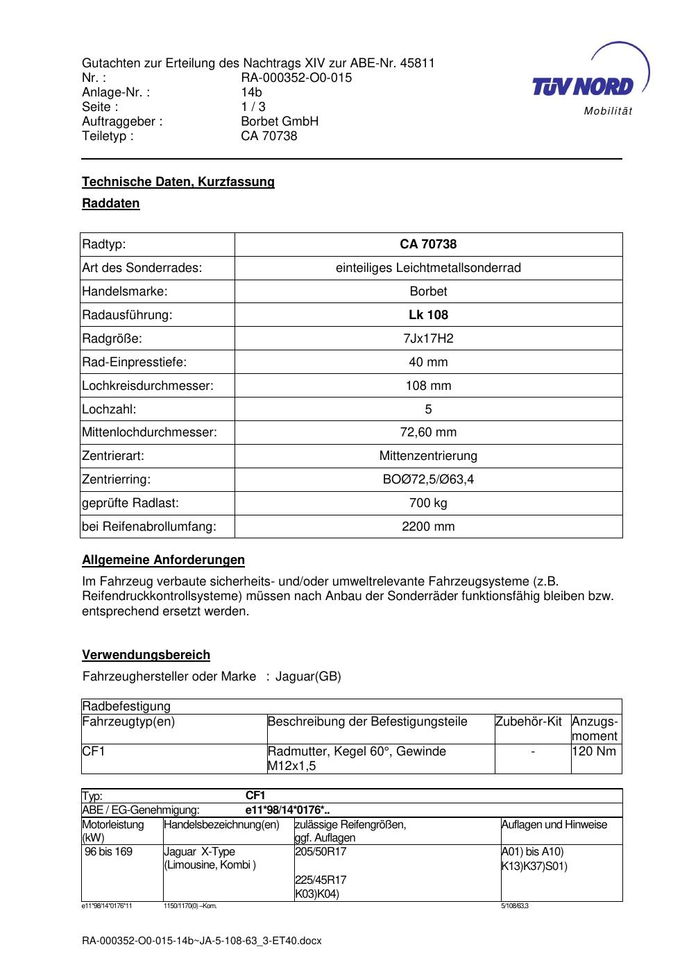 Dieses Gutachten (abe) bezieht sich auf die Alufelge Borbet CA 70738 in der Ausführung 7Jx17 ET 0, Mittenloch 0 mm (KBA 45811). Im PDF findest du typischerweise zulässige Reifengrößen, Auflagen/Anbauhinweise und – je nach Dokument – Hinweise zur Eintragung.