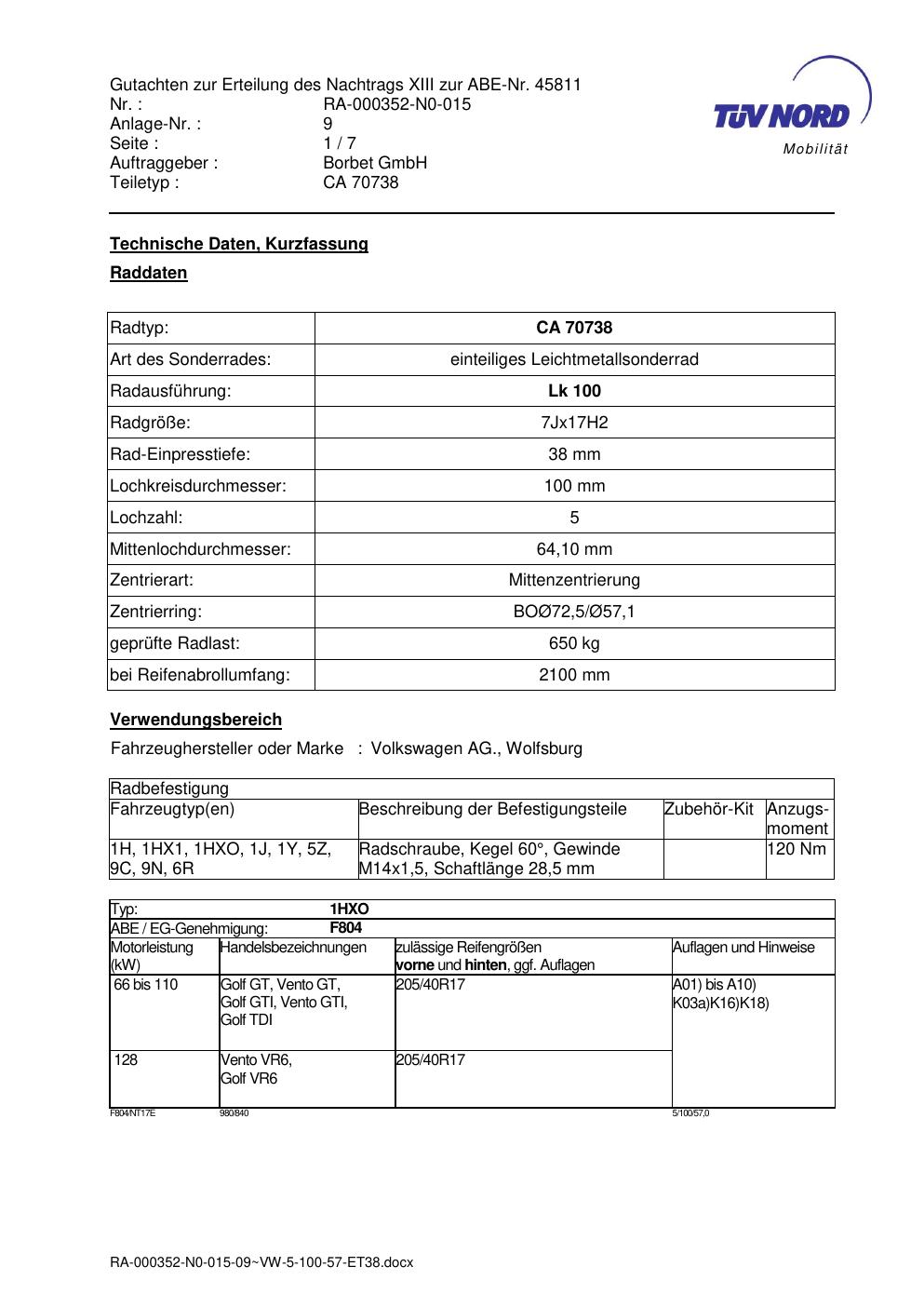 Dieses Gutachten (abe) bezieht sich auf die Alufelge Borbet CA 70738 in der Ausführung 7Jx17 ET 0, Mittenloch 0 mm (KBA 45811). Im PDF findest du typischerweise zulässige Reifengrößen, Auflagen/Anbauhinweise und – je nach Dokument – Hinweise zur Eintragung.