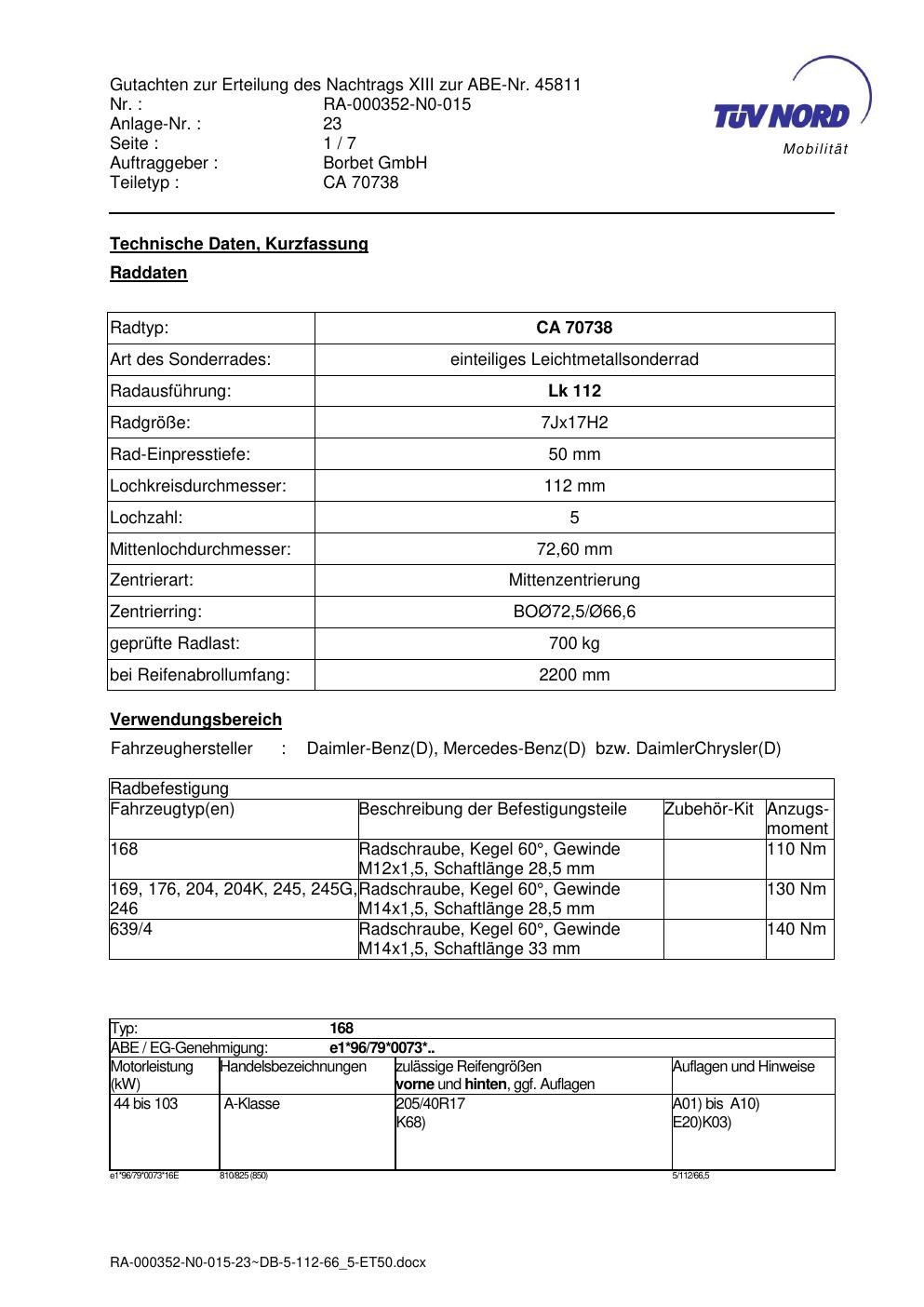 Dieses Gutachten (abe) bezieht sich auf die Alufelge Borbet CA 70738 in der Ausführung 7Jx17 ET 0, Mittenloch 0 mm (KBA 45811). Im PDF findest du typischerweise zulässige Reifengrößen, Auflagen/Anbauhinweise und – je nach Dokument – Hinweise zur Eintragung.