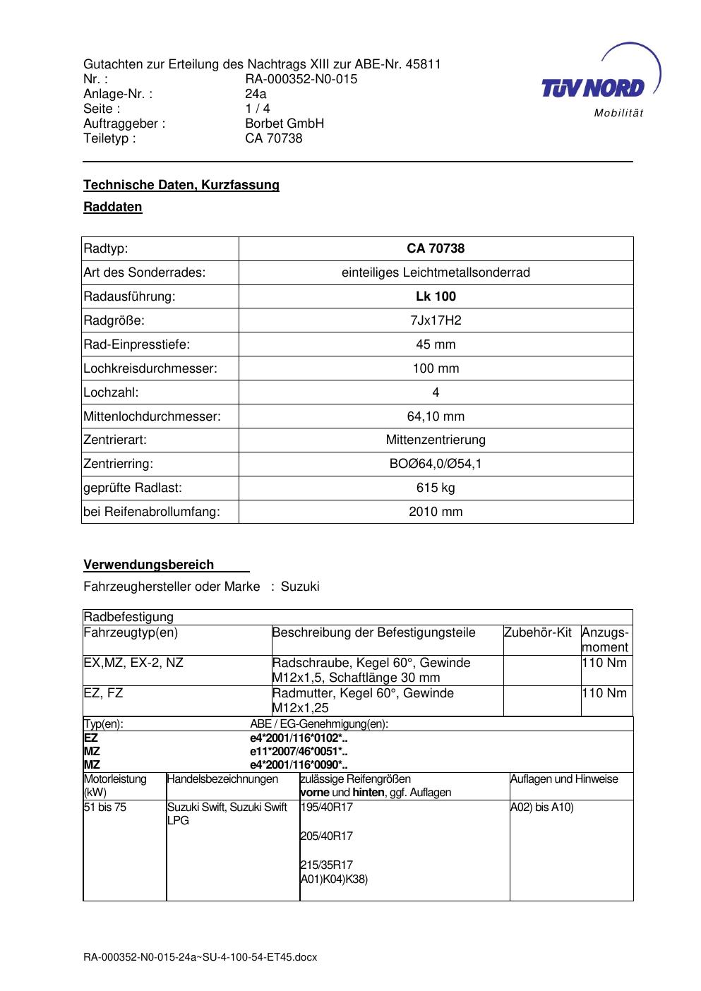 Dieses Gutachten (abe) bezieht sich auf die Alufelge Borbet CA 70738 in der Ausführung 7Jx17 ET 0, Mittenloch 0 mm (KBA 45811). Im PDF findest du typischerweise zulässige Reifengrößen, Auflagen/Anbauhinweise und – je nach Dokument – Hinweise zur Eintragung.
