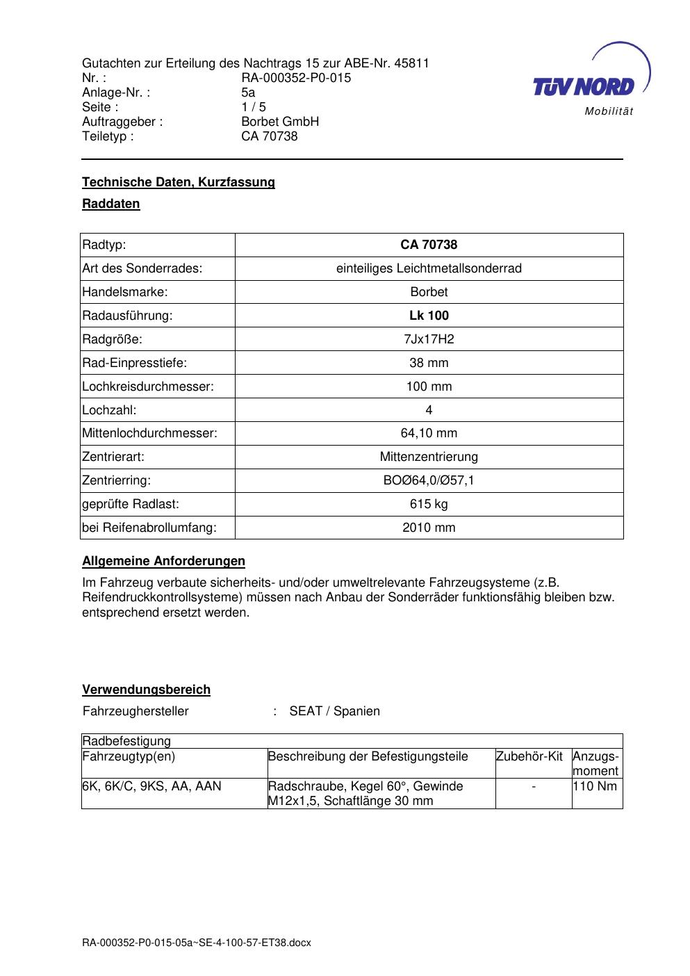 Dieses Gutachten (abe) bezieht sich auf die Alufelge brand-borbet CA 70738 in der Ausführung 7Jx17 ET 0, Mittenloch 0 mm (KBA 45811). Im PDF findest du typischerweise zulässige Reifengrößen, Auflagen/Anbauhinweise und – je nach Dokument – Hinweise zur Eintragung.