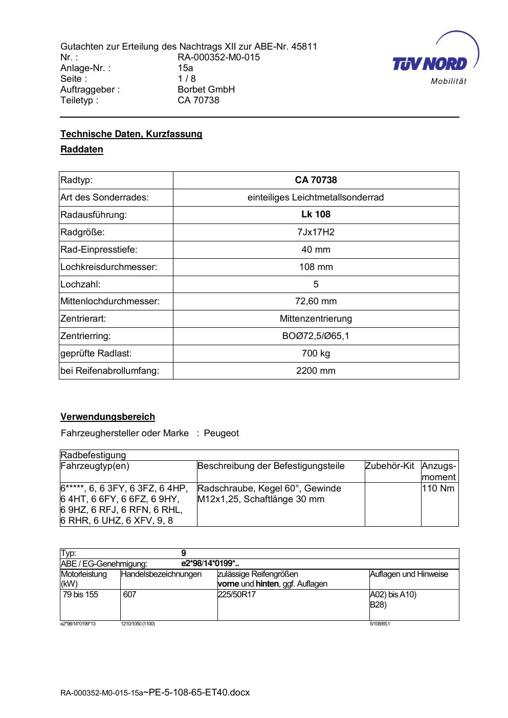 Dieses Gutachten (abe) bezieht sich auf die Alufelge Borbet CA 70738 in der Ausführung 7Jx17 ET 0, Mittenloch 0 mm (KBA 45811). Im PDF findest du typischerweise zulässige Reifengrößen, Auflagen/Anbauhinweise und – je nach Dokument – Hinweise zur Eintragung.