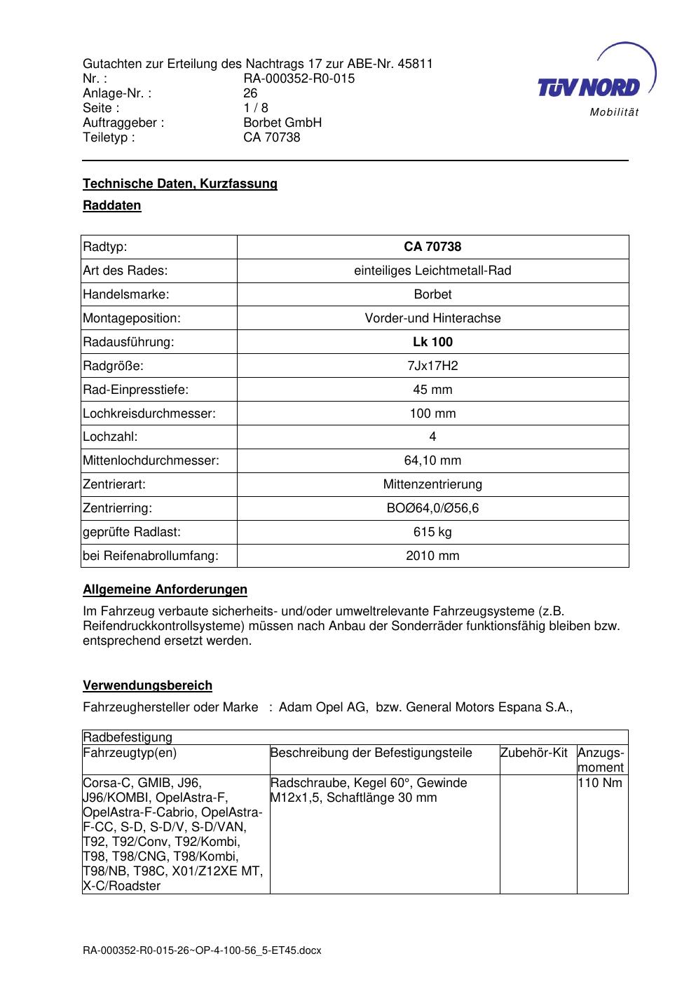 Dieses Gutachten (abe) bezieht sich auf die Alufelge Borbet CA 70738 in der Ausführung 7Jx17 ET 0, Mittenloch 0 mm (KBA 45811). Im PDF findest du typischerweise zulässige Reifengrößen, Auflagen/Anbauhinweise und – je nach Dokument – Hinweise zur Eintragung.