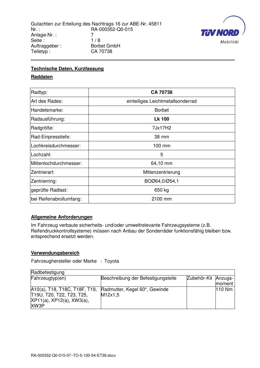 Dieses Gutachten (abe) bezieht sich auf die Alufelge Borbet CA 70738 in der Ausführung 7Jx17 ET 0, Mittenloch 0 mm (KBA 45811). Im PDF findest du typischerweise zulässige Reifengrößen, Auflagen/Anbauhinweise und – je nach Dokument – Hinweise zur Eintragung.