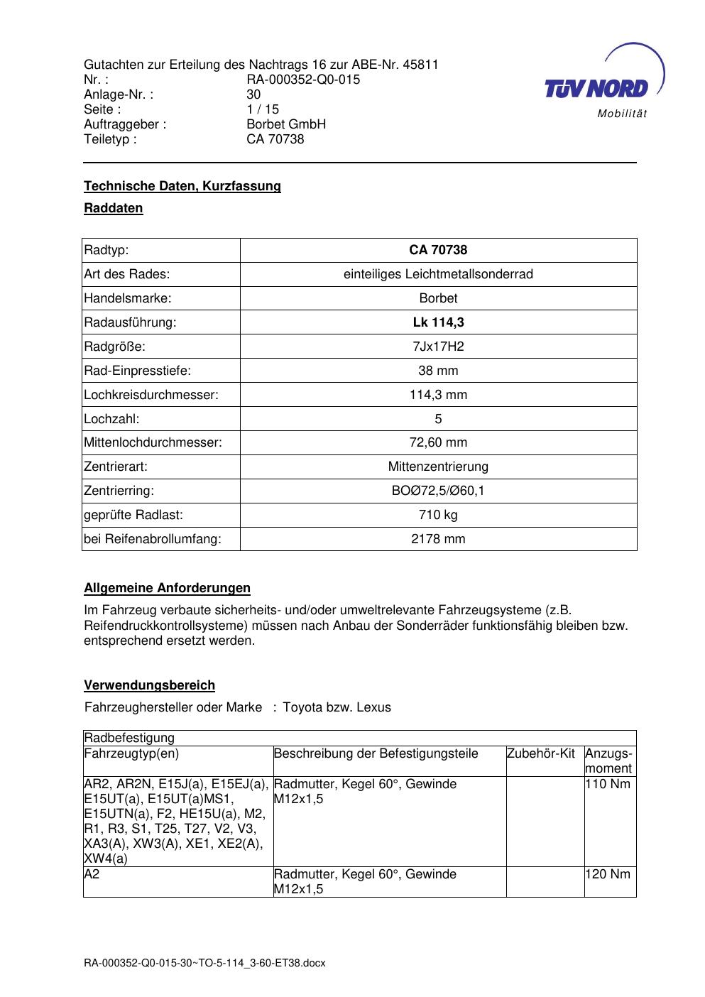 Dieses Gutachten (abe) bezieht sich auf die Alufelge Borbet CA 70738 in der Ausführung 7Jx17 ET 0, Mittenloch 0 mm (KBA 45811). Im PDF findest du typischerweise zulässige Reifengrößen, Auflagen/Anbauhinweise und – je nach Dokument – Hinweise zur Eintragung.