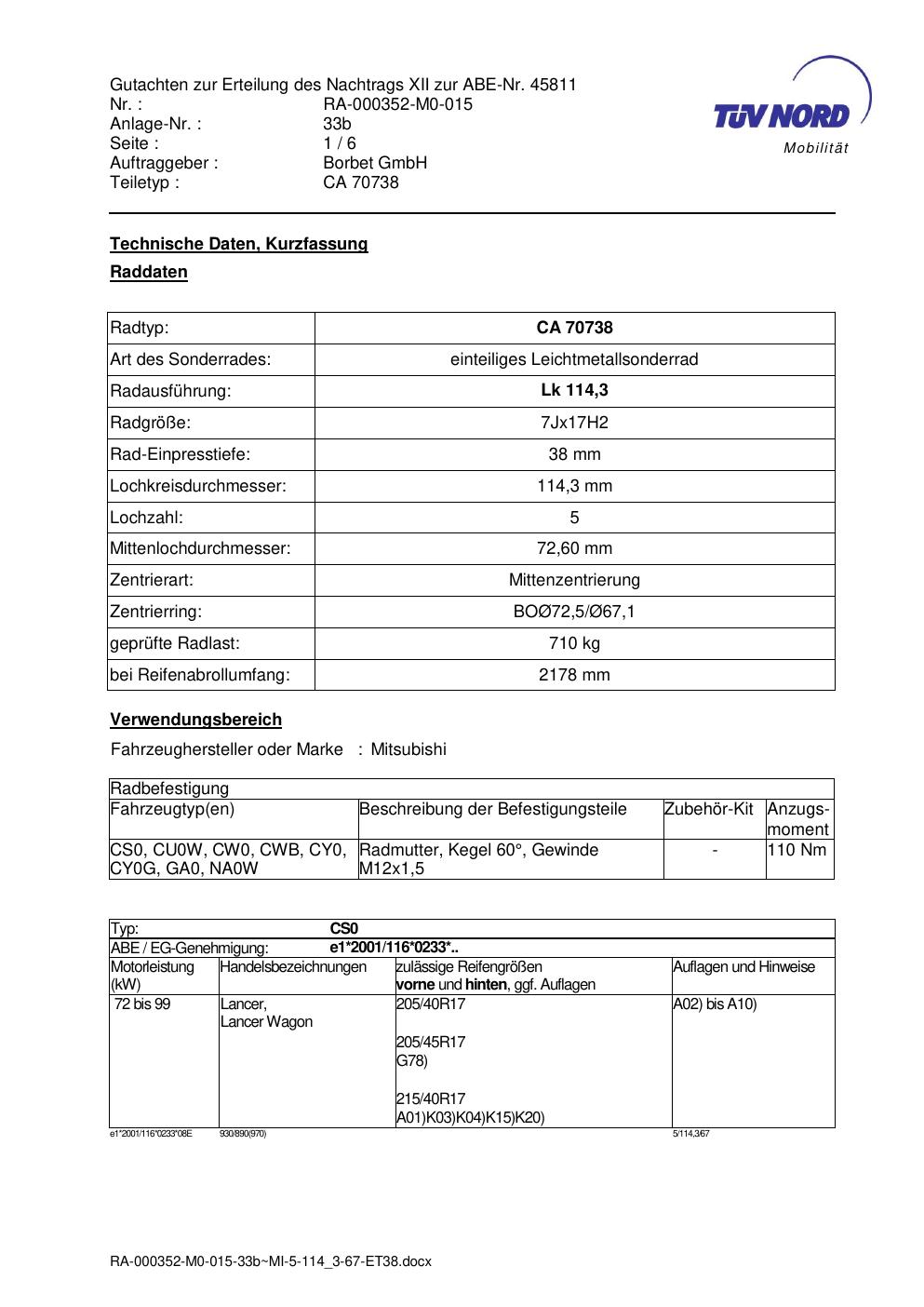 Dieses Gutachten (abe) bezieht sich auf die Alufelge Borbet CA 70738 in der Ausführung 7Jx17 ET 0, Mittenloch 0 mm (KBA 45811). Im PDF findest du typischerweise zulässige Reifengrößen, Auflagen/Anbauhinweise und – je nach Dokument – Hinweise zur Eintragung.