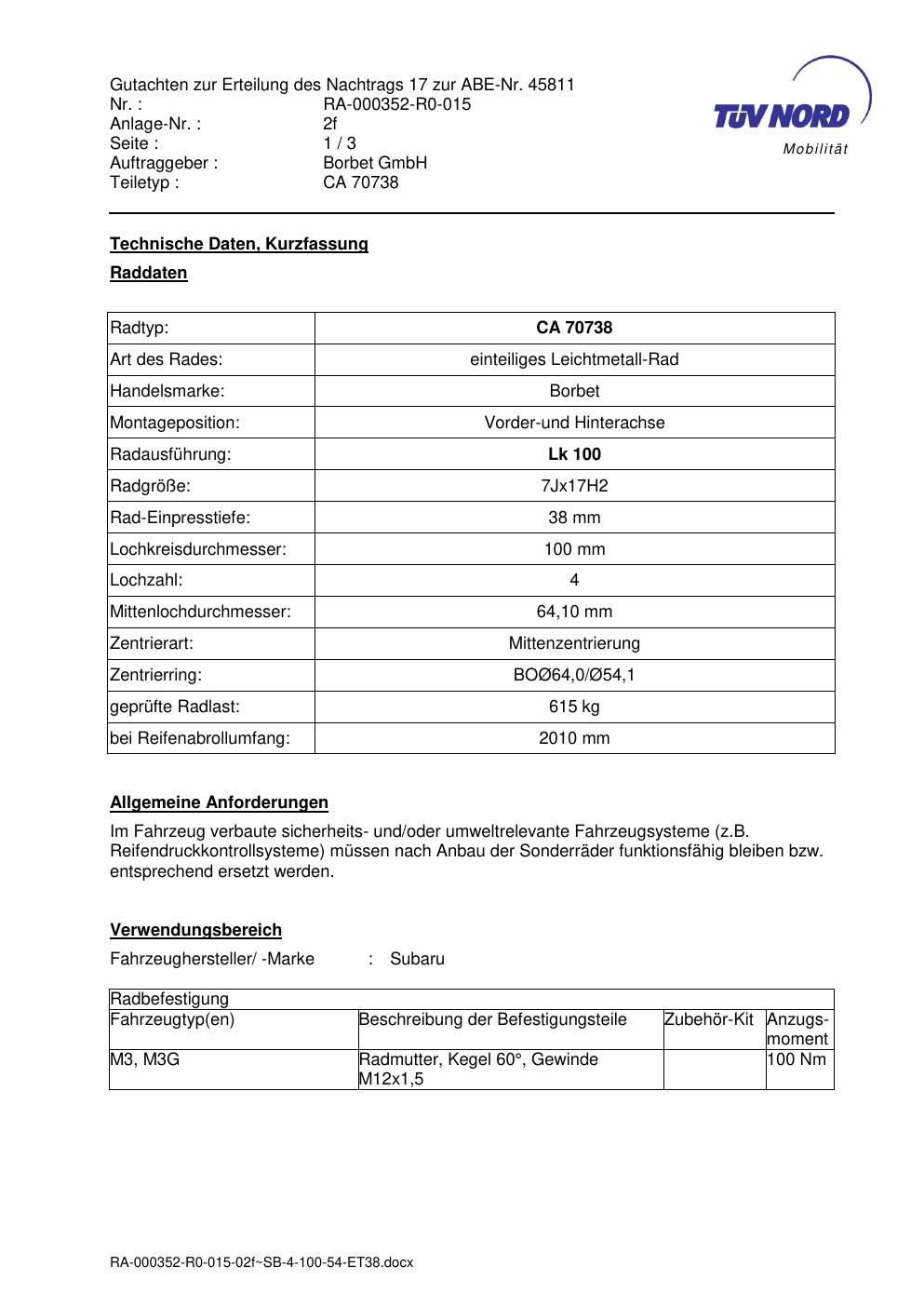 Dieses Gutachten (abe) bezieht sich auf die Alufelge Borbet CA 70738 in der Ausführung 7Jx17 ET 0, Mittenloch 0 mm (KBA 45811). Im PDF findest du typischerweise zulässige Reifengrößen, Auflagen/Anbauhinweise und – je nach Dokument – Hinweise zur Eintragung.