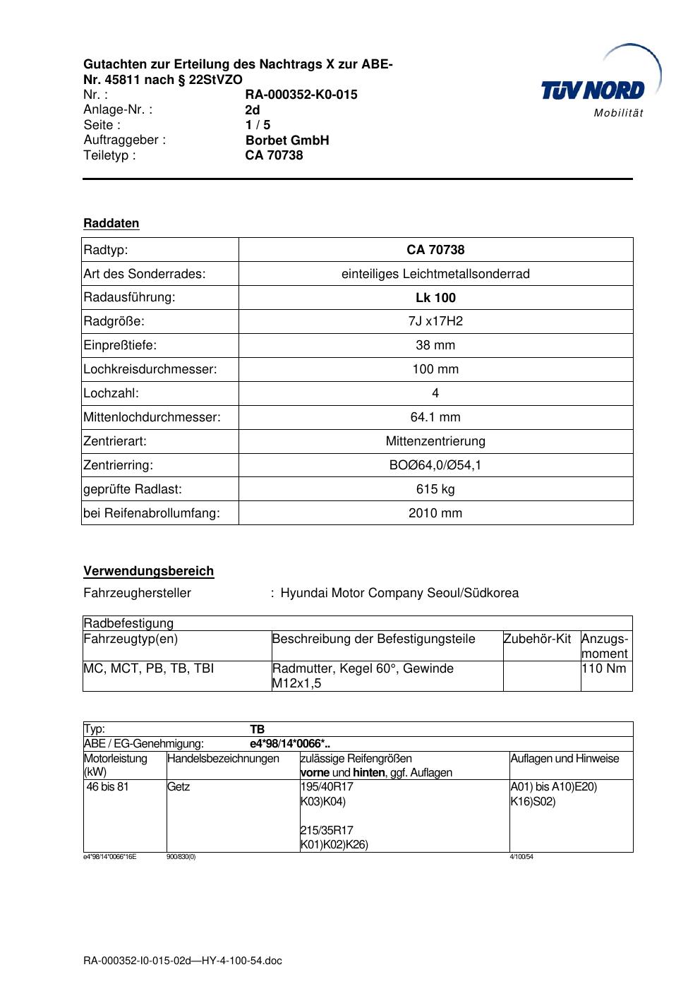 Felgengutachten / abe für Alufelgen brand-borbet CA 70738 (7Jx17 ET 0, Mittenloch 0 mm) mit KBA 45811 (Zertifikatsnummer 45811). Hier kostenlos als PDF herunterladen. Der Download-Link ist 24 Stunden gültig und kann bis zu zwei Mal verwendet werden.