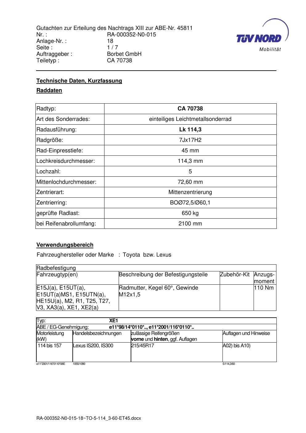 Dieses Gutachten (abe) bezieht sich auf die Alufelge Borbet CA 70738 in der Ausführung 7Jx17 ET 0, Mittenloch 0 mm (KBA 45811). Im PDF findest du typischerweise zulässige Reifengrößen, Auflagen/Anbauhinweise und – je nach Dokument – Hinweise zur Eintragung.
