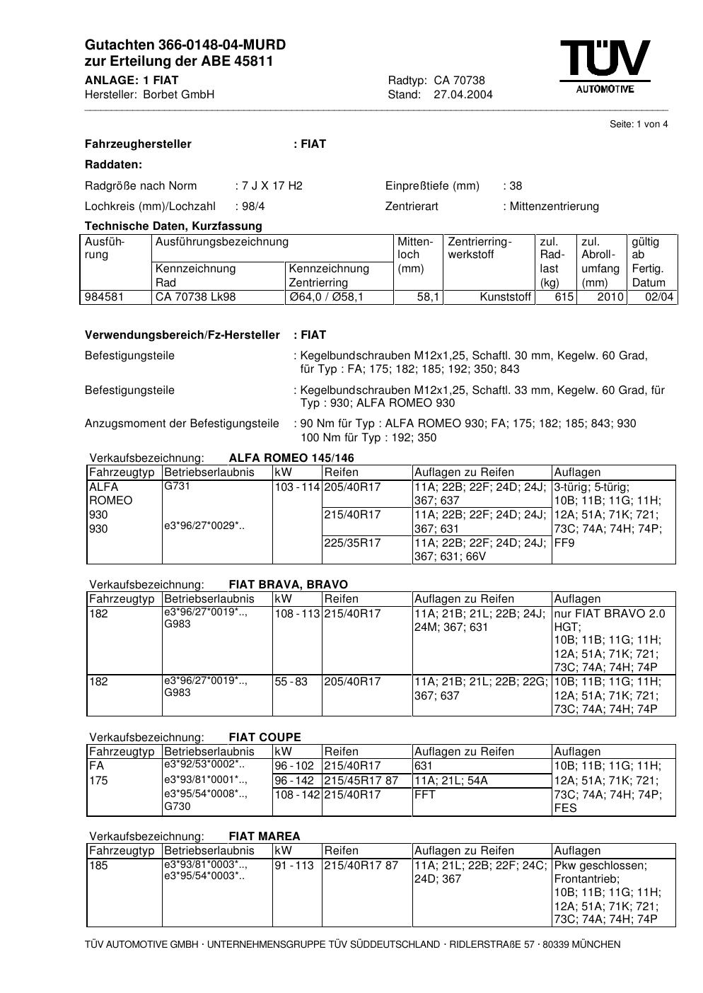 Dieses Gutachten (abe) bezieht sich auf die Alufelge brand-borbet CA 70738 in der Ausführung 7Jx17 ET 0, Mittenloch 0 mm (KBA 45811). Im PDF findest du typischerweise zulässige Reifengrößen, Auflagen/Anbauhinweise und – je nach Dokument – Hinweise zur Eintragung.