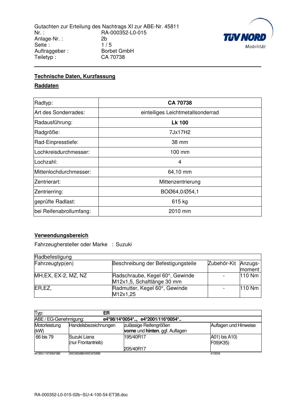 Dieses Gutachten (abe) bezieht sich auf die Alufelge Borbet CA 70738 in der Ausführung 7Jx17 ET 0, Mittenloch 0 mm (KBA 45811). Im PDF findest du typischerweise zulässige Reifengrößen, Auflagen/Anbauhinweise und – je nach Dokument – Hinweise zur Eintragung.