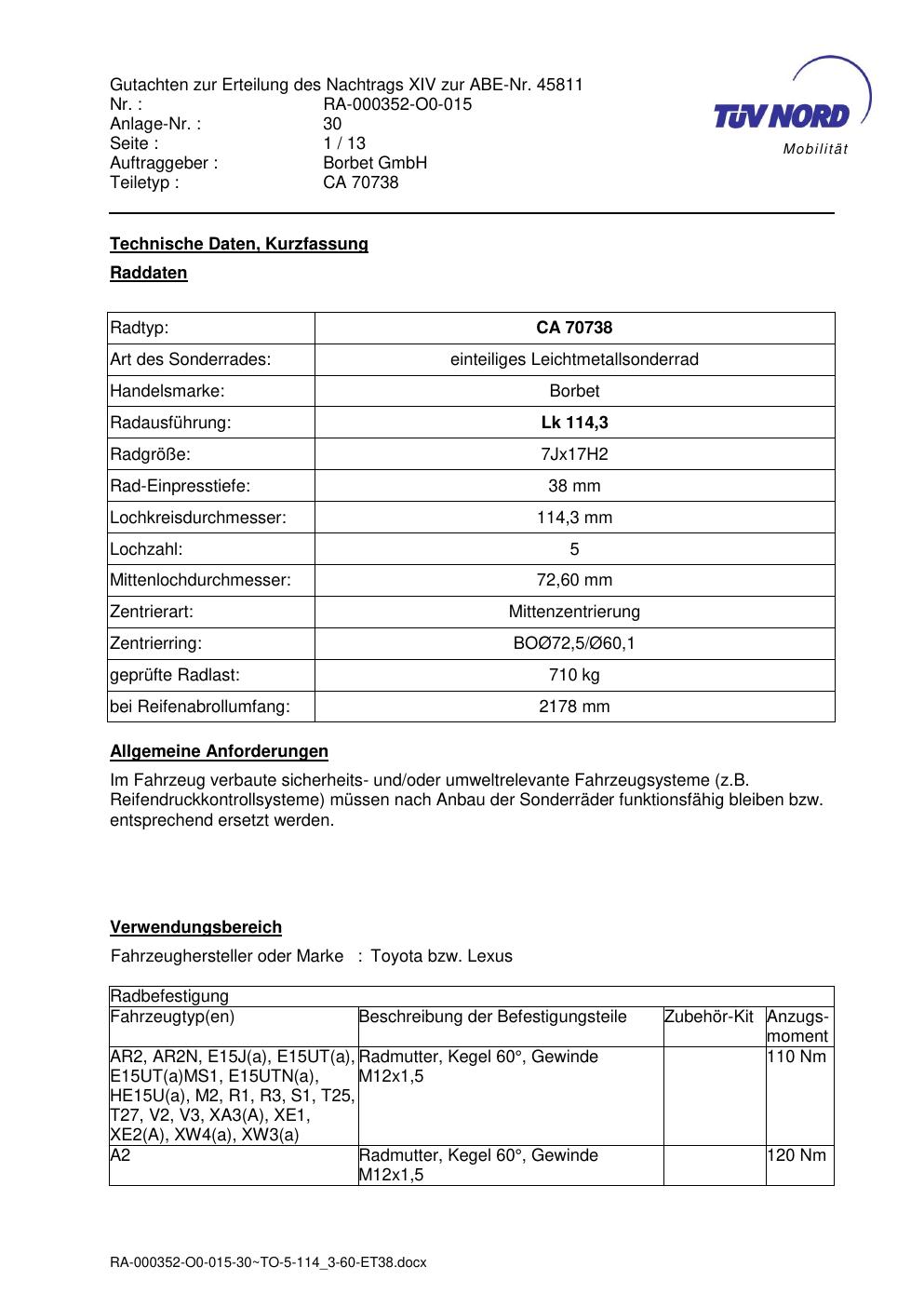 • Stimmt die KBA-Nummer auf der Felge mit diesem Dokument überein?