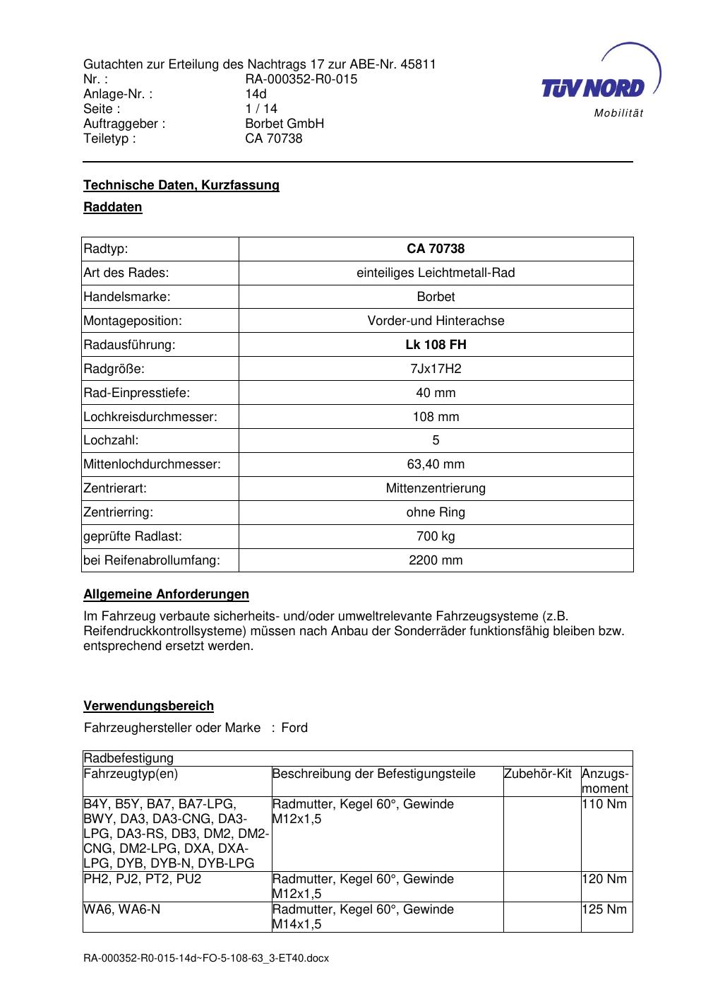 Dieses Gutachten (abe) bezieht sich auf die Alufelge Borbet CA 70738 in der Ausführung 7Jx17 ET 0, Mittenloch 0 mm (KBA 45811). Im PDF findest du typischerweise zulässige Reifengrößen, Auflagen/Anbauhinweise und – je nach Dokument – Hinweise zur Eintragung.