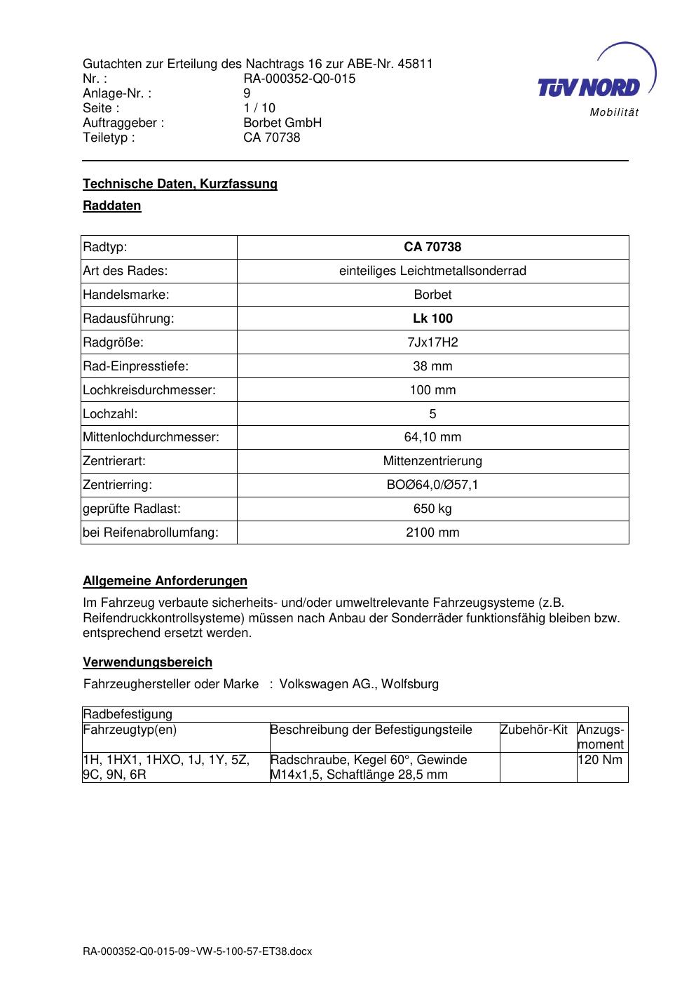 Dieses Gutachten (abe) bezieht sich auf die Alufelge Borbet CA 70738 in der Ausführung 7Jx17 ET 0, Mittenloch 0 mm (KBA 45811). Im PDF findest du typischerweise zulässige Reifengrößen, Auflagen/Anbauhinweise und – je nach Dokument – Hinweise zur Eintragung.