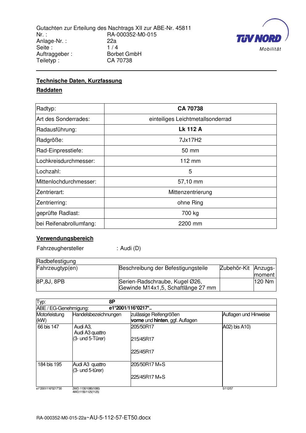 Dieses Gutachten (abe) bezieht sich auf die Alufelge Borbet CA 70738 in der Ausführung 7Jx17 ET 0, Mittenloch 0 mm (KBA 45811). Im PDF findest du typischerweise zulässige Reifengrößen, Auflagen/Anbauhinweise und – je nach Dokument – Hinweise zur Eintragung.