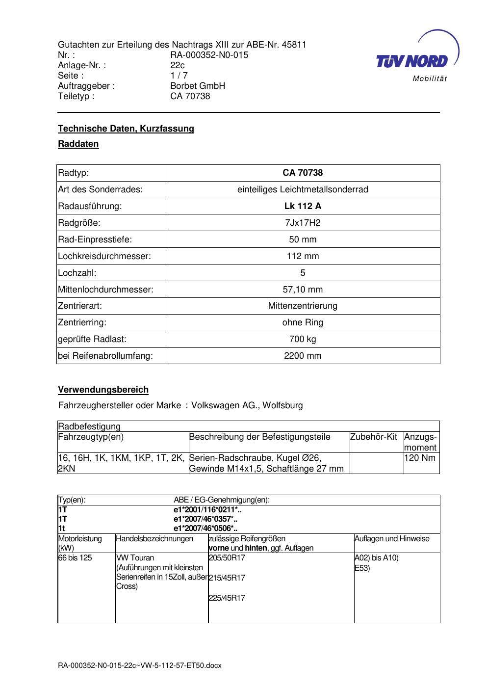 Dieses Gutachten (abe) bezieht sich auf die Alufelge Borbet CA 70738 in der Ausführung 7Jx17 ET 0, Mittenloch 0 mm (KBA 45811). Im PDF findest du typischerweise zulässige Reifengrößen, Auflagen/Anbauhinweise und – je nach Dokument – Hinweise zur Eintragung.