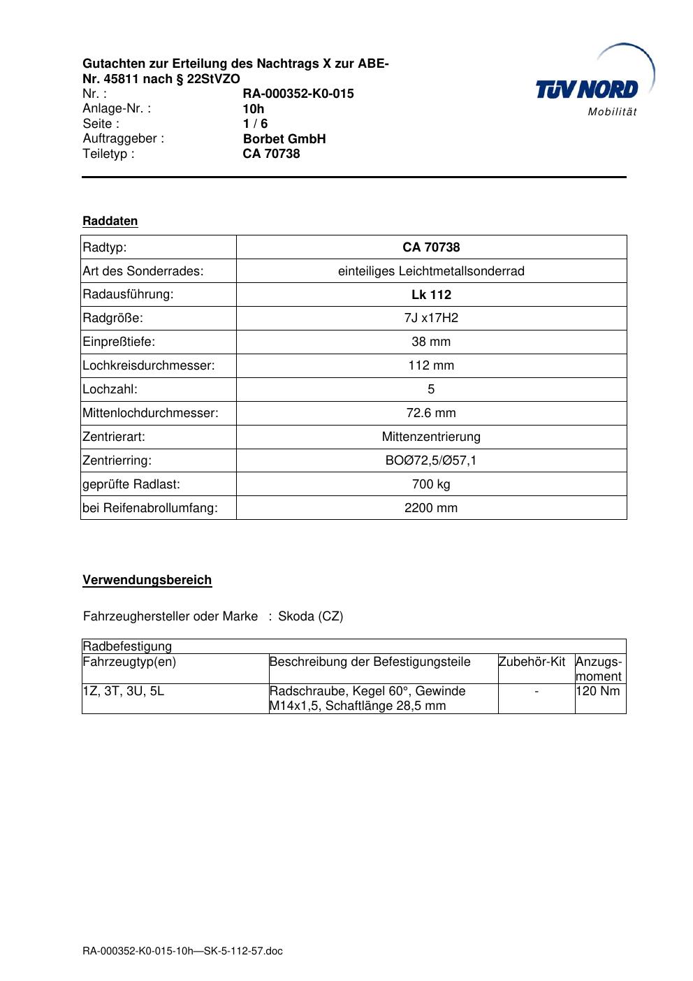 Dieses Gutachten (abe) bezieht sich auf die Alufelge Borbet CA 70738 in der Ausführung 7Jx17 ET 0, Mittenloch 0 mm (KBA 45811). Im PDF findest du typischerweise zulässige Reifengrößen, Auflagen/Anbauhinweise und – je nach Dokument – Hinweise zur Eintragung.