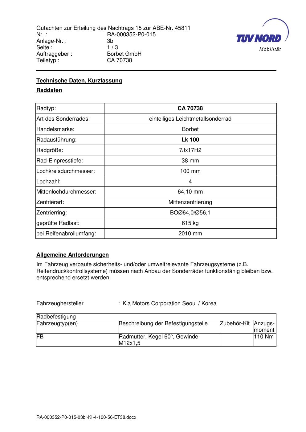 Dieses Gutachten (abe) bezieht sich auf die Alufelge Borbet CA 70738 in der Ausführung 7Jx17 ET 0, Mittenloch 0 mm (KBA 45811). Im PDF findest du typischerweise zulässige Reifengrößen, Auflagen/Anbauhinweise und – je nach Dokument – Hinweise zur Eintragung.
