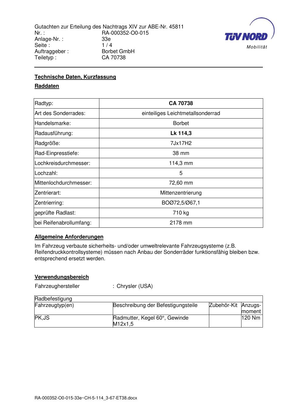 Dieses Gutachten (abe) bezieht sich auf die Alufelge brand-borbet CA 70738 in der Ausführung 7Jx17 ET 0, Mittenloch 0 mm (KBA 45811). Im PDF findest du typischerweise zulässige Reifengrößen, Auflagen/Anbauhinweise und – je nach Dokument – Hinweise zur Eintragung.