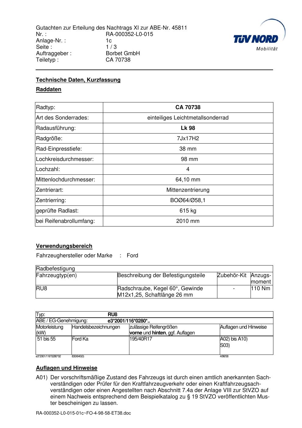 Dieses Gutachten (abe) bezieht sich auf die Alufelge Borbet CA 70738 in der Ausführung 7Jx17 ET 0, Mittenloch 0 mm (KBA 45811). Im PDF findest du typischerweise zulässige Reifengrößen, Auflagen/Anbauhinweise und – je nach Dokument – Hinweise zur Eintragung.