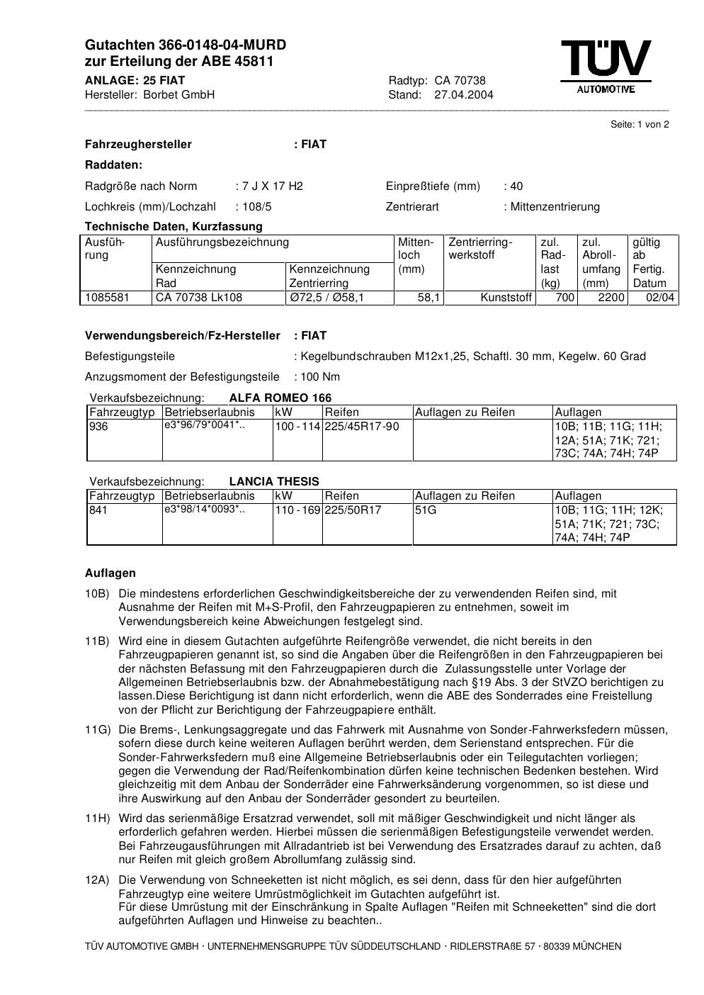 Dieses Gutachten (abe) bezieht sich auf die Alufelge Borbet CA 70738 in der Ausführung 7Jx17 ET 0, Mittenloch 0 mm (KBA 45811). Im PDF findest du typischerweise zulässige Reifengrößen, Auflagen/Anbauhinweise und – je nach Dokument – Hinweise zur Eintragung.