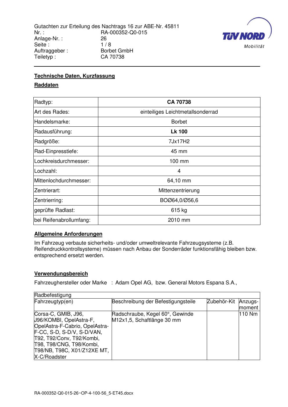 Dieses Gutachten (abe) bezieht sich auf die Alufelge Borbet CA 70738 in der Ausführung 7Jx17 ET 0, Mittenloch 0 mm (KBA 45811). Im PDF findest du typischerweise zulässige Reifengrößen, Auflagen/Anbauhinweise und – je nach Dokument – Hinweise zur Eintragung.