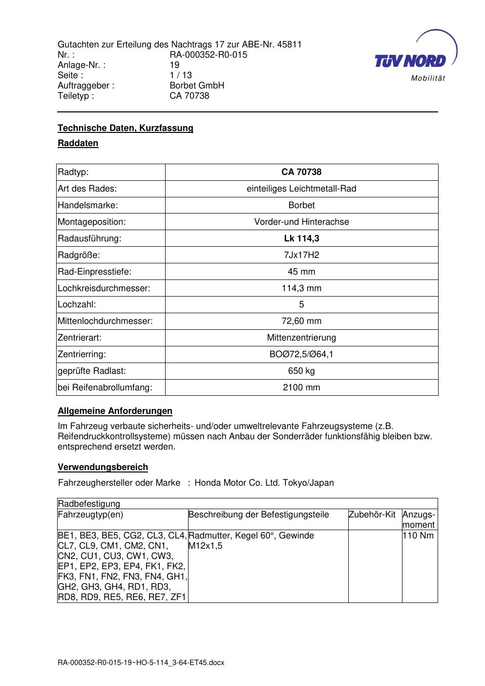 Dieses Gutachten (abe) bezieht sich auf die Alufelge Borbet CA 70738 in der Ausführung 7Jx17 ET 0, Mittenloch 0 mm (KBA 45811). Im PDF findest du typischerweise zulässige Reifengrößen, Auflagen/Anbauhinweise und – je nach Dokument – Hinweise zur Eintragung.