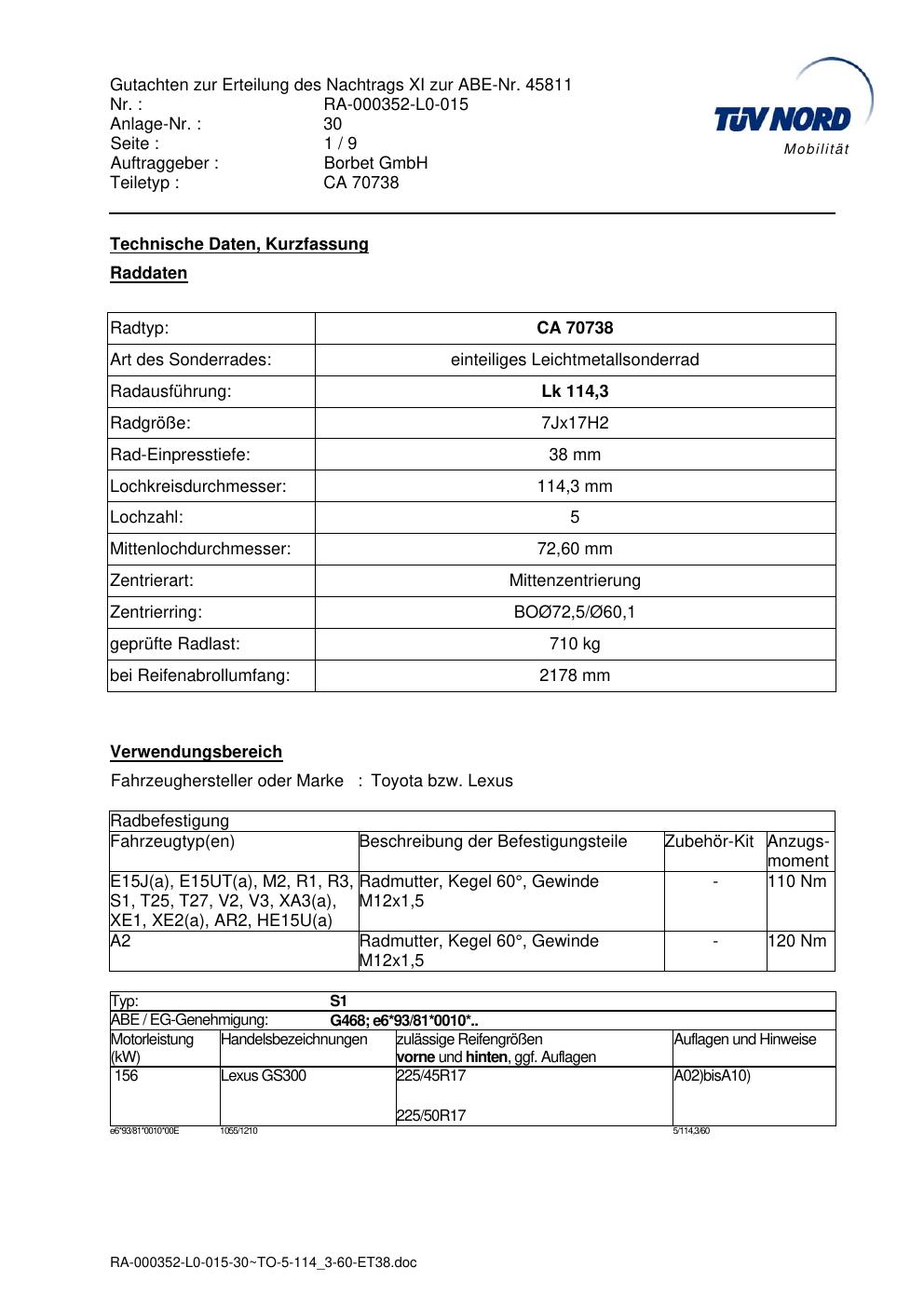 Dieses Gutachten (abe) bezieht sich auf die Alufelge Borbet CA 70738 in der Ausführung 7Jx17 ET 0, Mittenloch 0 mm (KBA 45811). Im PDF findest du typischerweise zulässige Reifengrößen, Auflagen/Anbauhinweise und – je nach Dokument – Hinweise zur Eintragung.