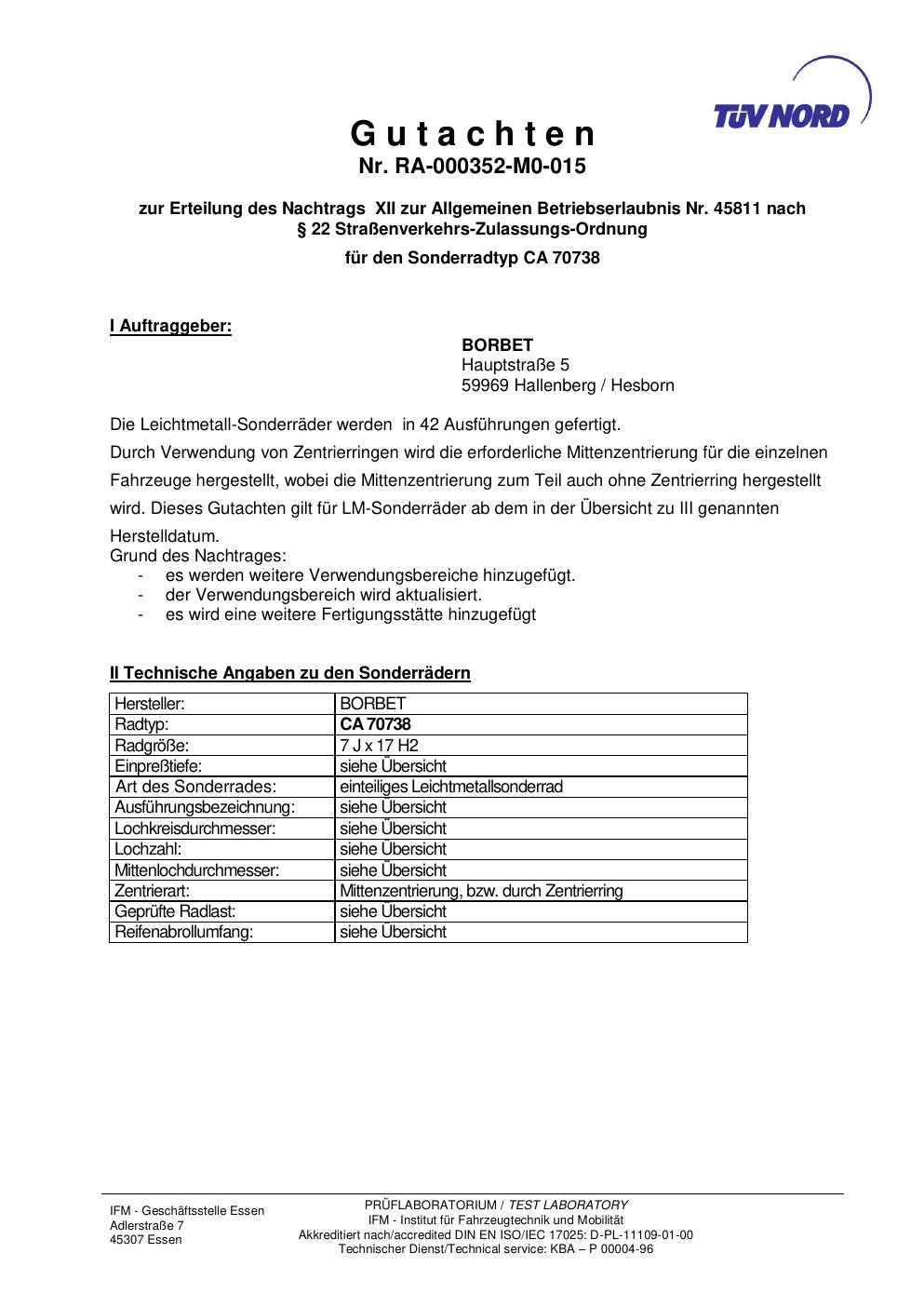 Dieses Gutachten (abe) bezieht sich auf die Alufelge Borbet CA 70738 in der Ausführung 7Jx17 ET 0, Mittenloch 0 mm (KBA 45811). Im PDF findest du typischerweise zulässige Reifengrößen, Auflagen/Anbauhinweise und – je nach Dokument – Hinweise zur Eintragung.