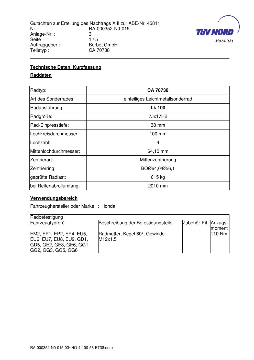 Dieses Gutachten (abe) bezieht sich auf die Alufelge Borbet CA 70738 in der Ausführung 7Jx17 ET 0, Mittenloch 0 mm (KBA 45811). Im PDF findest du typischerweise zulässige Reifengrößen, Auflagen/Anbauhinweise und – je nach Dokument – Hinweise zur Eintragung.
