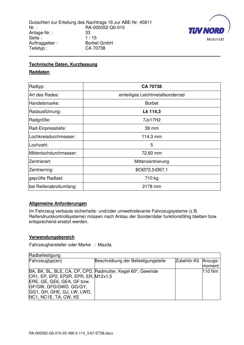 Dieses Gutachten (abe) bezieht sich auf die Alufelge Borbet CA 70738 in der Ausführung 7Jx17 ET 0, Mittenloch 0 mm (KBA 45811). Im PDF findest du typischerweise zulässige Reifengrößen, Auflagen/Anbauhinweise und – je nach Dokument – Hinweise zur Eintragung.