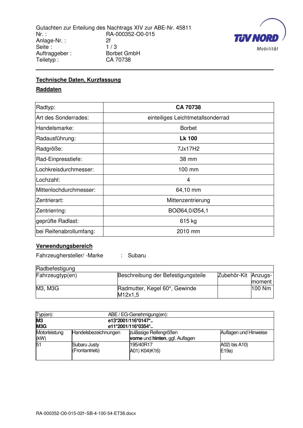 Dieses Gutachten (abe) bezieht sich auf die Alufelge Borbet CA 70738 in der Ausführung 7Jx17 ET 0, Mittenloch 0 mm (KBA 45811). Im PDF findest du typischerweise zulässige Reifengrößen, Auflagen/Anbauhinweise und – je nach Dokument – Hinweise zur Eintragung.