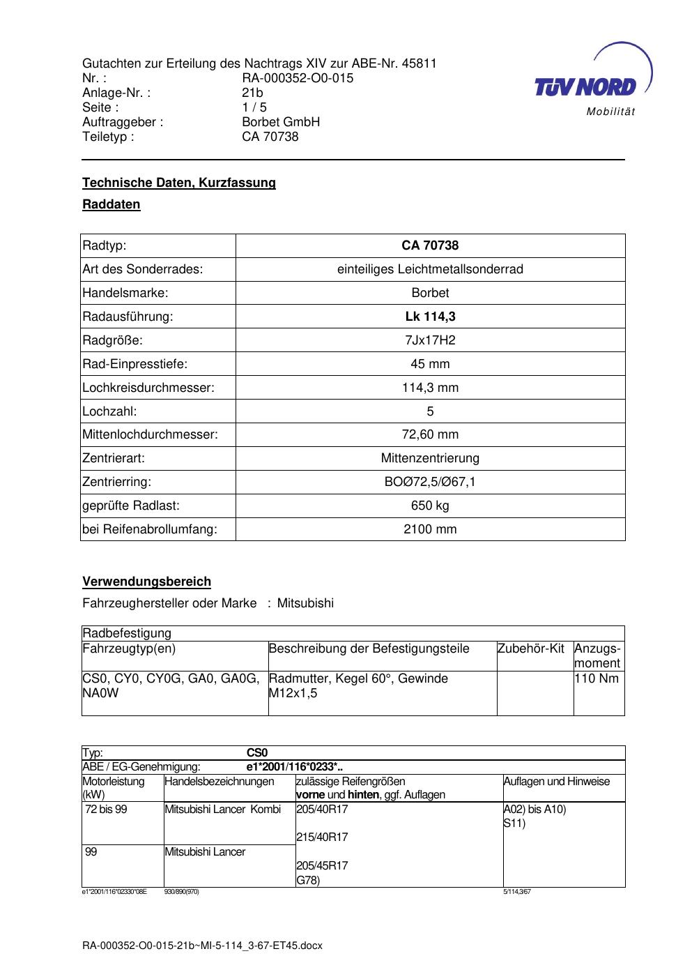 Dieses Gutachten (abe) bezieht sich auf die Alufelge brand-borbet CA 70738 in der Ausführung 7Jx17 ET 0, Mittenloch 0 mm (KBA 45811). Im PDF findest du typischerweise zulässige Reifengrößen, Auflagen/Anbauhinweise und – je nach Dokument – Hinweise zur Eintragung.