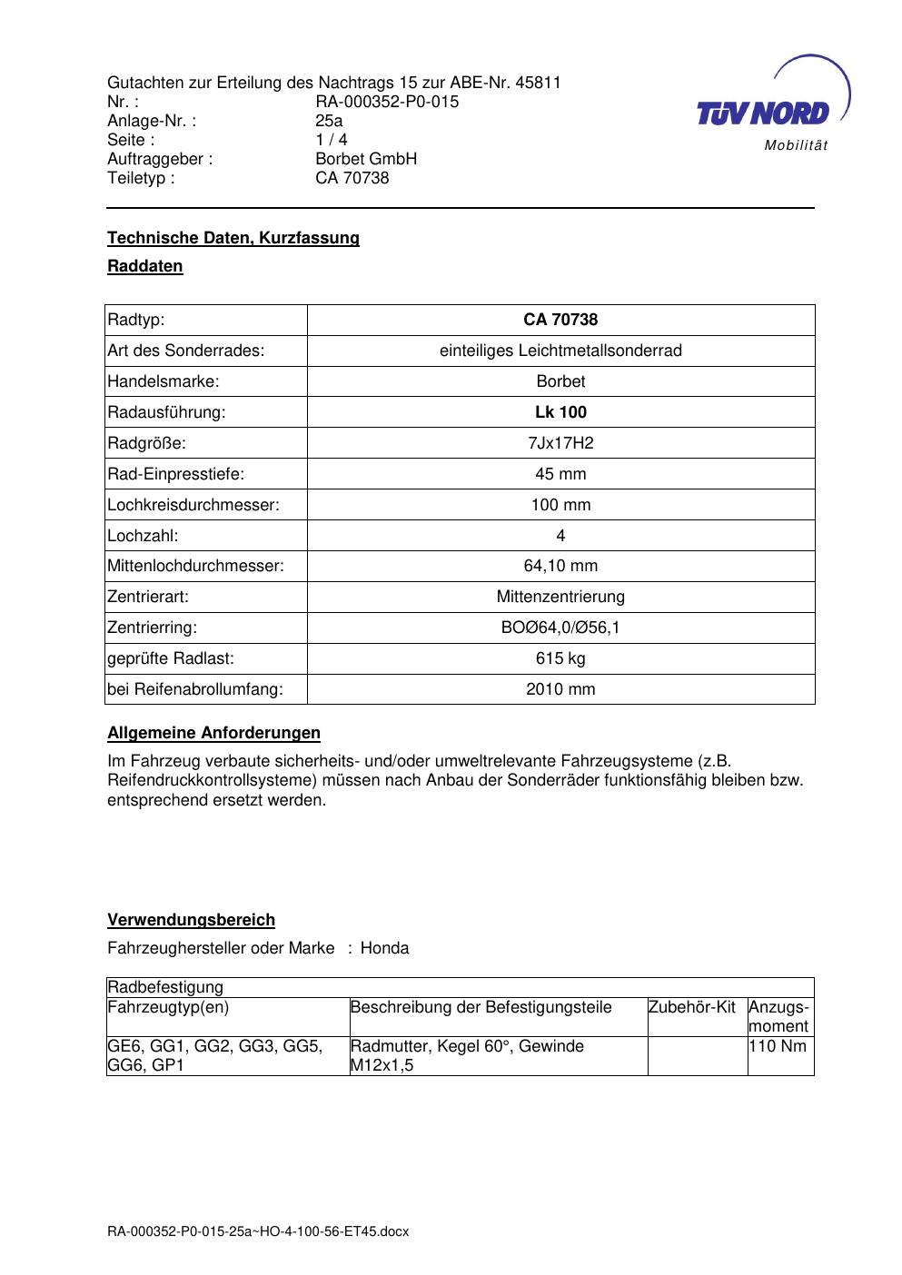 Dieses Gutachten (abe) bezieht sich auf die Alufelge Borbet CA 70738 in der Ausführung 7Jx17 ET 0, Mittenloch 0 mm (KBA 45811). Im PDF findest du typischerweise zulässige Reifengrößen, Auflagen/Anbauhinweise und – je nach Dokument – Hinweise zur Eintragung.