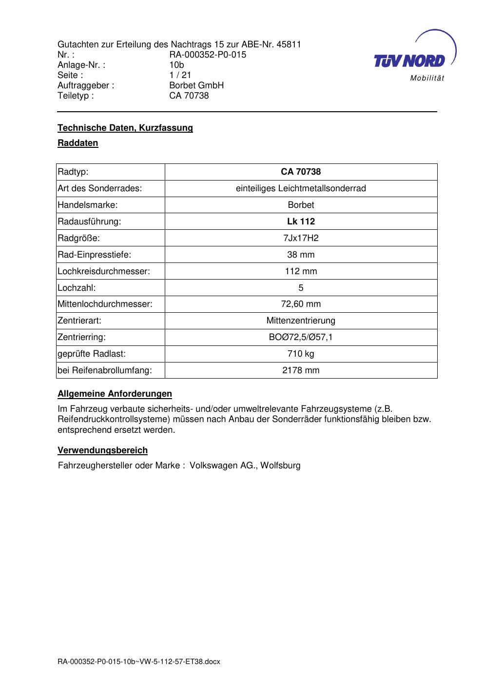 Dieses Gutachten (abe) bezieht sich auf die Alufelge Borbet CA 70738 in der Ausführung 7Jx17 ET 0, Mittenloch 0 mm (KBA 45811). Im PDF findest du typischerweise zulässige Reifengrößen, Auflagen/Anbauhinweise und – je nach Dokument – Hinweise zur Eintragung.