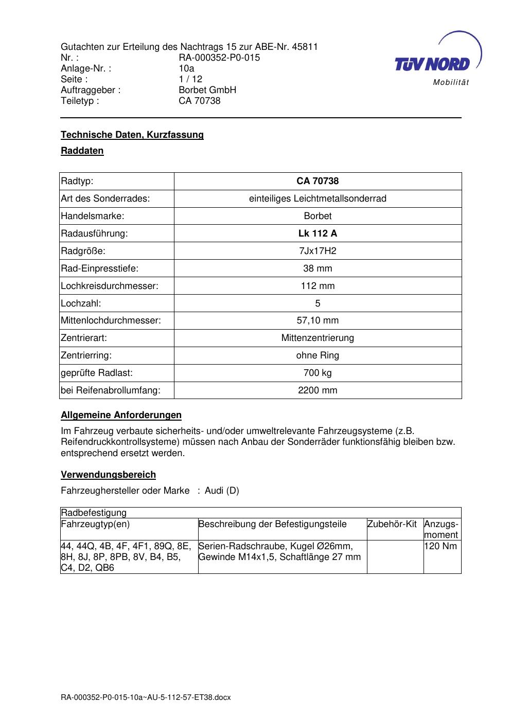 Dieses Gutachten (abe) bezieht sich auf die Alufelge Borbet CA 70738 in der Ausführung 7Jx17 ET 0, Mittenloch 0 mm (KBA 45811). Im PDF findest du typischerweise zulässige Reifengrößen, Auflagen/Anbauhinweise und – je nach Dokument – Hinweise zur Eintragung.