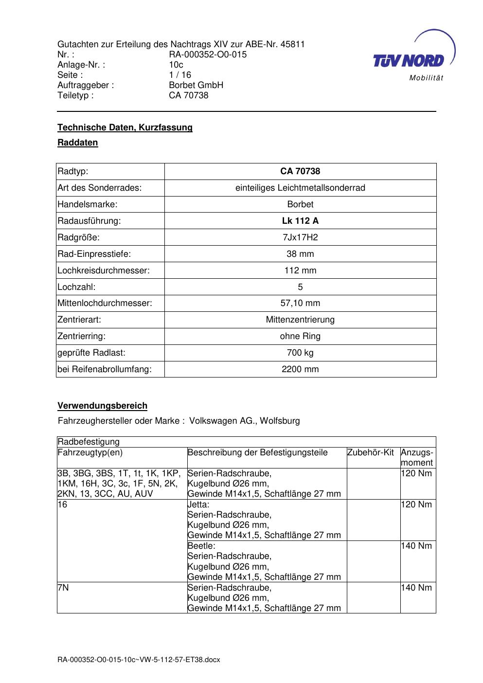Dieses Gutachten (abe) bezieht sich auf die Alufelge Borbet CA 70738 in der Ausführung 7Jx17 ET 0, Mittenloch 0 mm (KBA 45811). Im PDF findest du typischerweise zulässige Reifengrößen, Auflagen/Anbauhinweise und – je nach Dokument – Hinweise zur Eintragung.