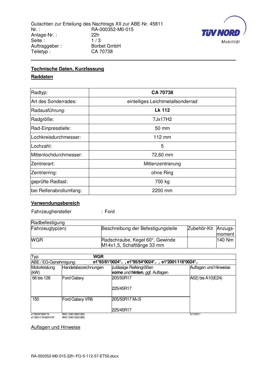 Dieses Gutachten (abe) bezieht sich auf die Alufelge Borbet CA 70738 in der Ausführung 7Jx17 ET 0, Mittenloch 0 mm (KBA 45811). Im PDF findest du typischerweise zulässige Reifengrößen, Auflagen/Anbauhinweise und – je nach Dokument – Hinweise zur Eintragung.