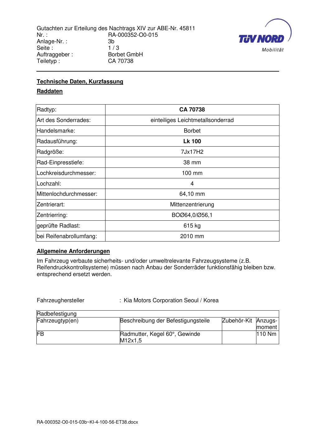 Dieses Gutachten (abe) bezieht sich auf die Alufelge Borbet CA 70738 in der Ausführung 7Jx17 ET 0, Mittenloch 0 mm (KBA 45811). Im PDF findest du typischerweise zulässige Reifengrößen, Auflagen/Anbauhinweise und – je nach Dokument – Hinweise zur Eintragung.