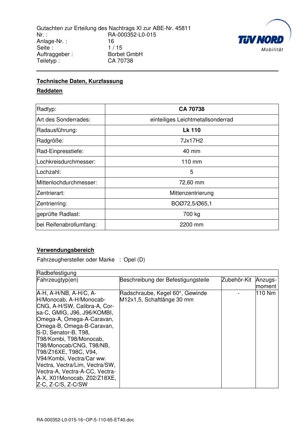 Dieses Gutachten (abe) bezieht sich auf die Alufelge Borbet CA 70738 in der Ausführung 7Jx17 ET 0, Mittenloch 0 mm (KBA 45811). Im PDF findest du typischerweise zulässige Reifengrößen, Auflagen/Anbauhinweise und – je nach Dokument – Hinweise zur Eintragung.