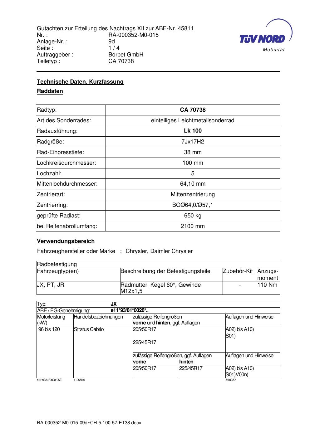 Dieses Gutachten (abe) bezieht sich auf die Alufelge Borbet CA 70738 in der Ausführung 7Jx17 ET 0, Mittenloch 0 mm (KBA 45811). Im PDF findest du typischerweise zulässige Reifengrößen, Auflagen/Anbauhinweise und – je nach Dokument – Hinweise zur Eintragung.