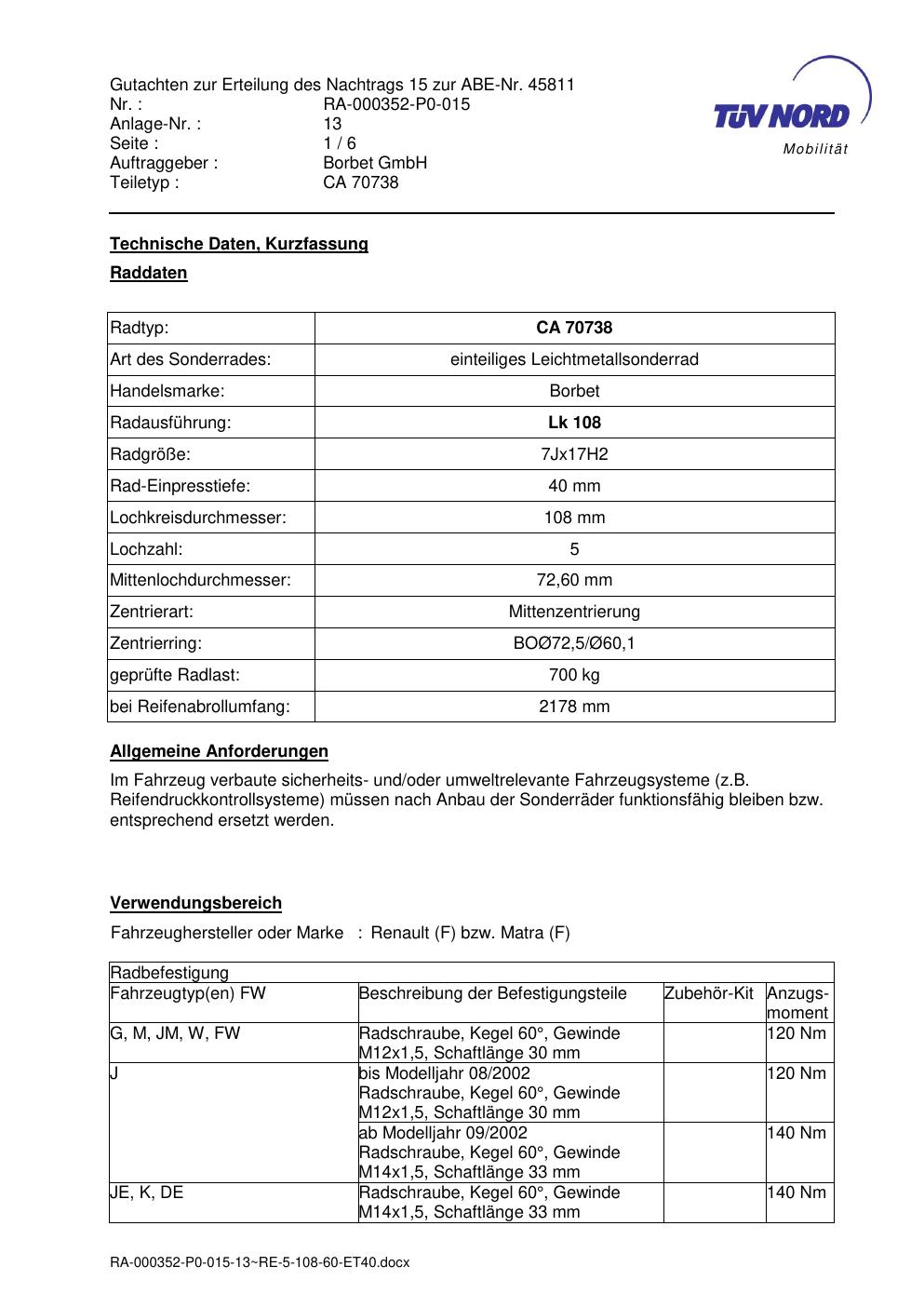 Dieses Gutachten (abe) bezieht sich auf die Alufelge Borbet CA 70738 in der Ausführung 7Jx17 ET 0, Mittenloch 0 mm (KBA 45811). Im PDF findest du typischerweise zulässige Reifengrößen, Auflagen/Anbauhinweise und – je nach Dokument – Hinweise zur Eintragung.