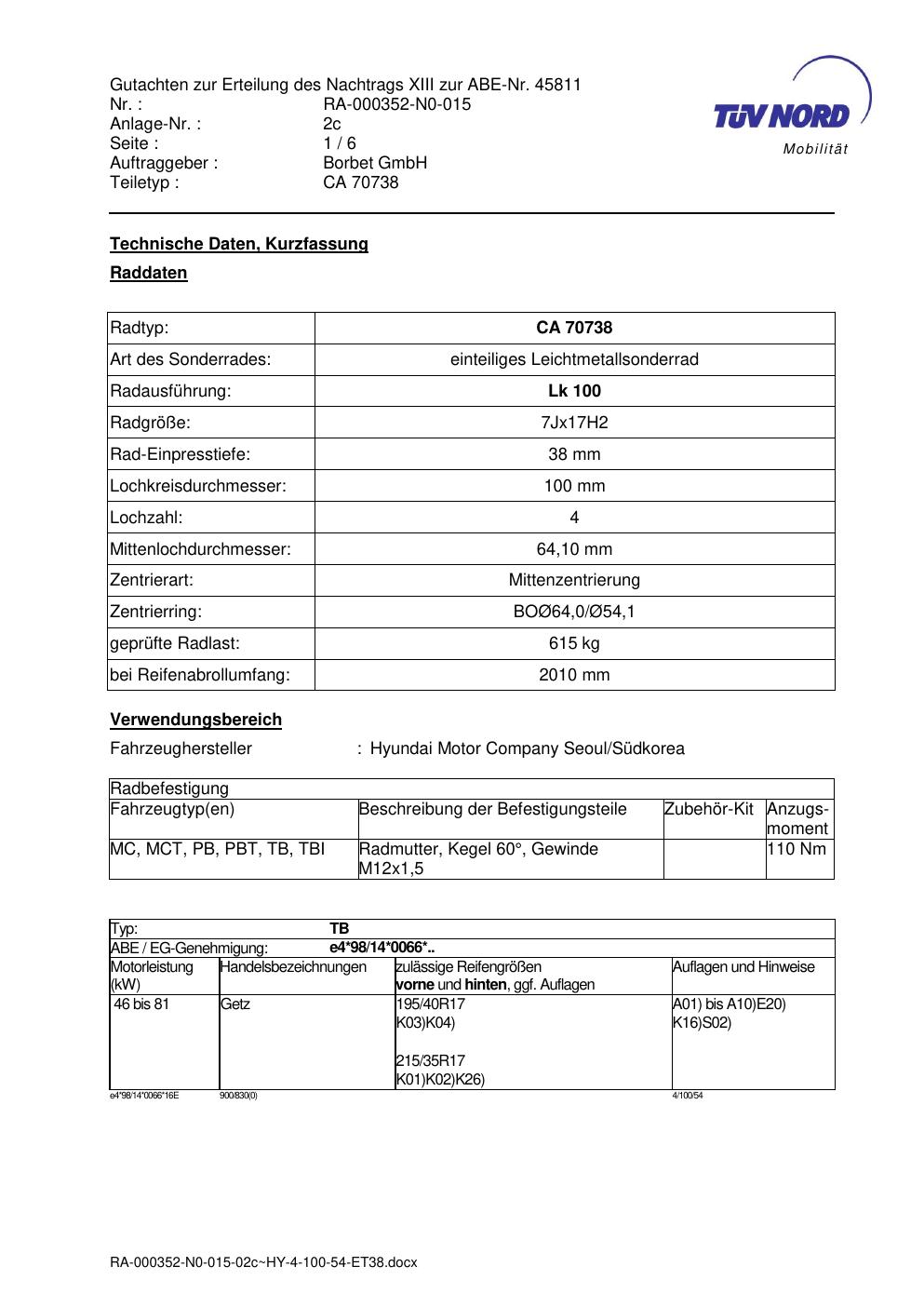 Dieses Gutachten (abe) bezieht sich auf die Alufelge Borbet CA 70738 in der Ausführung 7Jx17 ET 0, Mittenloch 0 mm (KBA 45811). Im PDF findest du typischerweise zulässige Reifengrößen, Auflagen/Anbauhinweise und – je nach Dokument – Hinweise zur Eintragung.