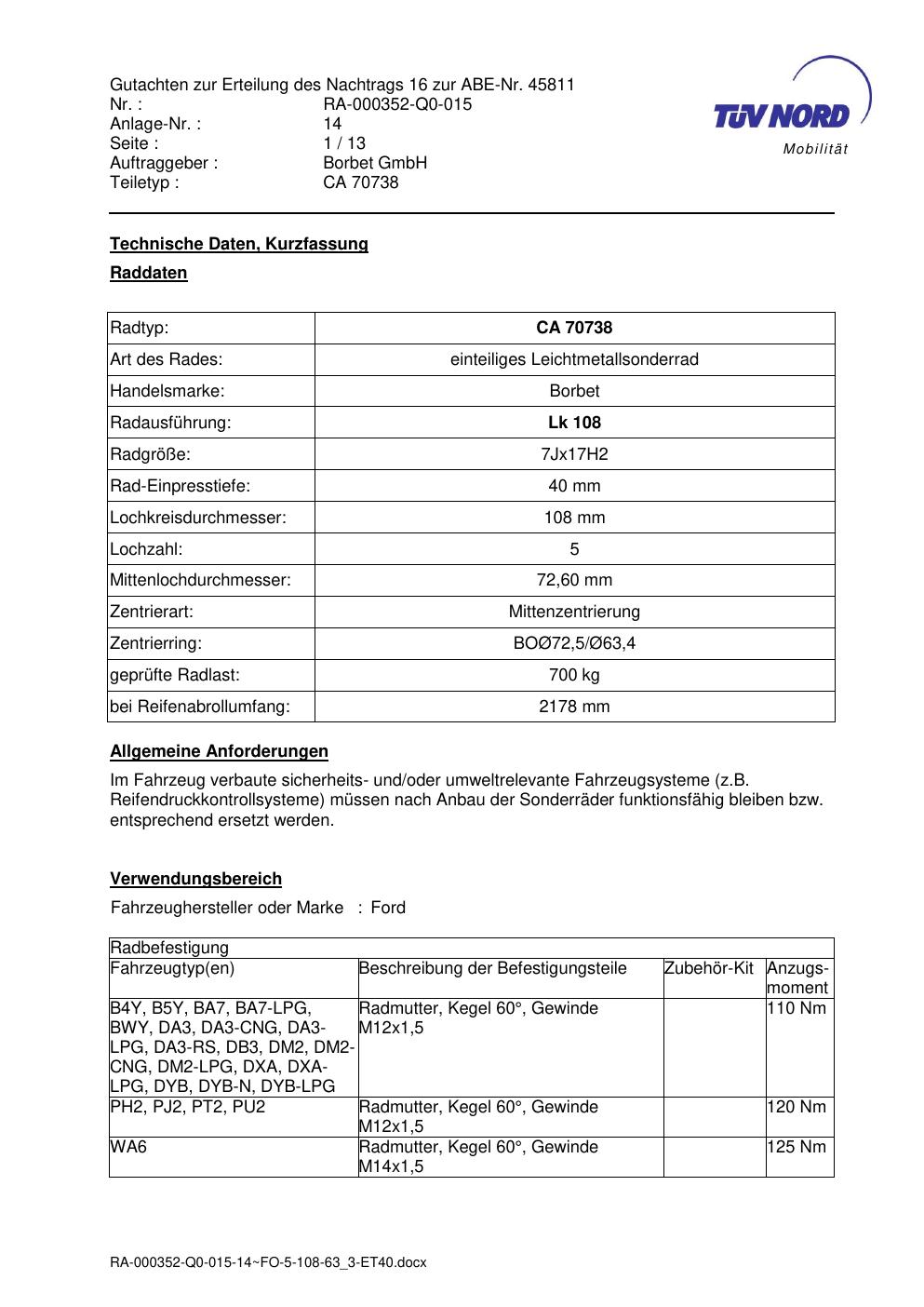 Dieses Gutachten (abe) bezieht sich auf die Alufelge Borbet CA 70738 in der Ausführung 7Jx17 ET 0, Mittenloch 0 mm (KBA 45811). Im PDF findest du typischerweise zulässige Reifengrößen, Auflagen/Anbauhinweise und – je nach Dokument – Hinweise zur Eintragung.