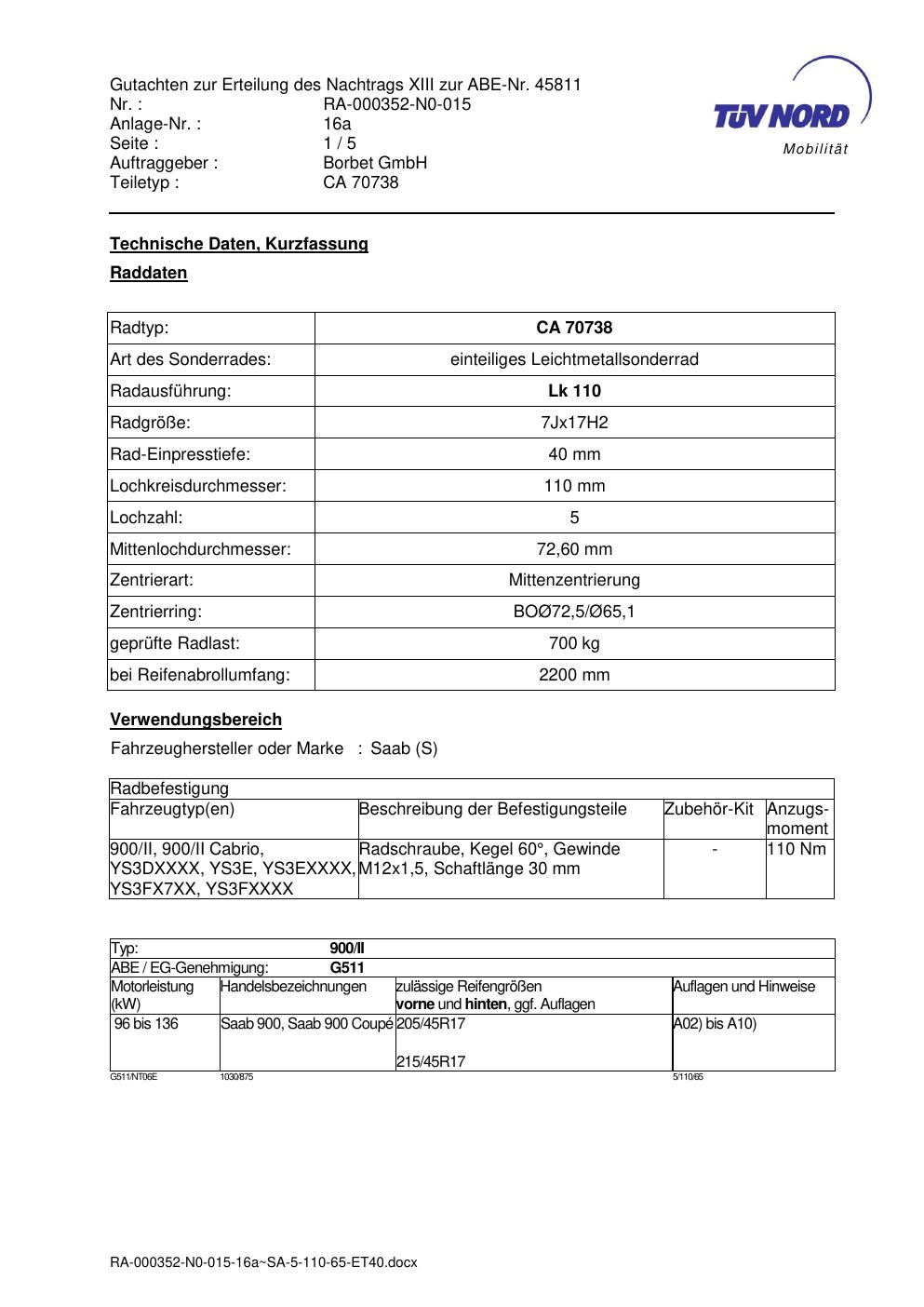 Dieses Gutachten (abe) bezieht sich auf die Alufelge Borbet CA 70738 in der Ausführung 7Jx17 ET 0, Mittenloch 0 mm (KBA 45811). Im PDF findest du typischerweise zulässige Reifengrößen, Auflagen/Anbauhinweise und – je nach Dokument – Hinweise zur Eintragung.