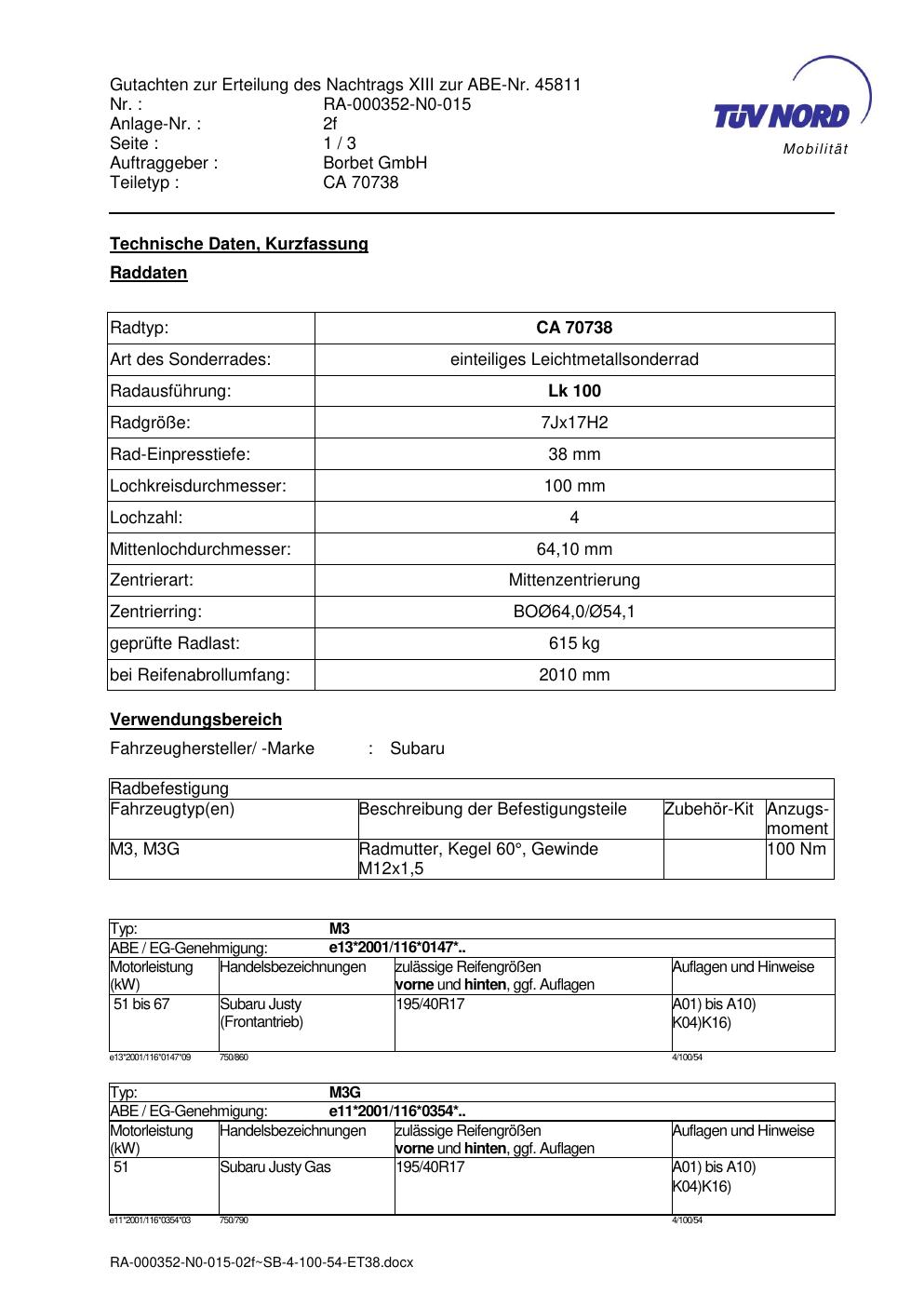 Dieses Gutachten (abe) bezieht sich auf die Alufelge Borbet CA 70738 in der Ausführung 7Jx17 ET 0, Mittenloch 0 mm (KBA 45811). Im PDF findest du typischerweise zulässige Reifengrößen, Auflagen/Anbauhinweise und – je nach Dokument – Hinweise zur Eintragung.