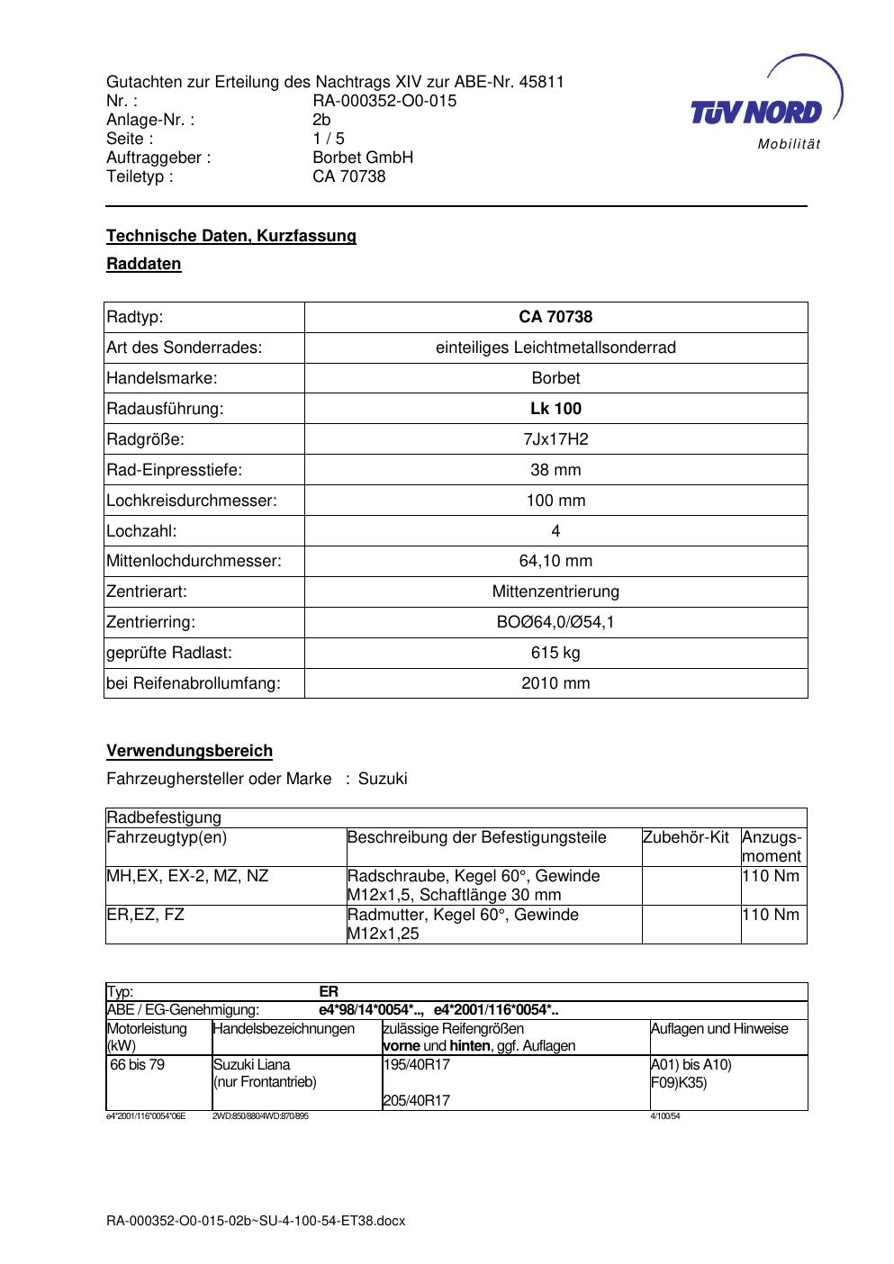 Dieses Gutachten (abe) bezieht sich auf die Alufelge Borbet CA 70738 in der Ausführung 7Jx17 ET 0, Mittenloch 0 mm (KBA 45811). Im PDF findest du typischerweise zulässige Reifengrößen, Auflagen/Anbauhinweise und – je nach Dokument – Hinweise zur Eintragung.