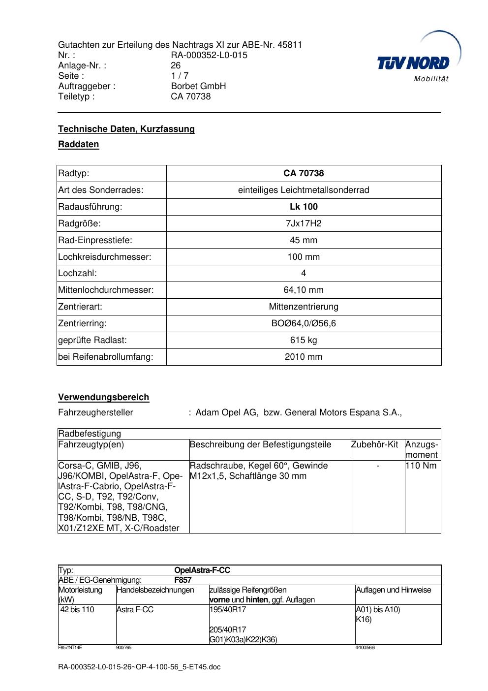 Dieses Gutachten (abe) bezieht sich auf die Alufelge Borbet CA 70738 in der Ausführung 7Jx17 ET 0, Mittenloch 0 mm (KBA 45811). Im PDF findest du typischerweise zulässige Reifengrößen, Auflagen/Anbauhinweise und – je nach Dokument – Hinweise zur Eintragung.