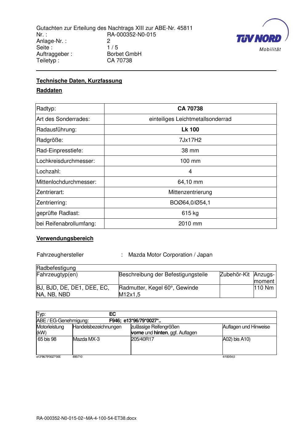 Dieses Gutachten (abe) bezieht sich auf die Alufelge Borbet CA 70738 in der Ausführung 7Jx17 ET 0, Mittenloch 0 mm (KBA 45811). Im PDF findest du typischerweise zulässige Reifengrößen, Auflagen/Anbauhinweise und – je nach Dokument – Hinweise zur Eintragung.